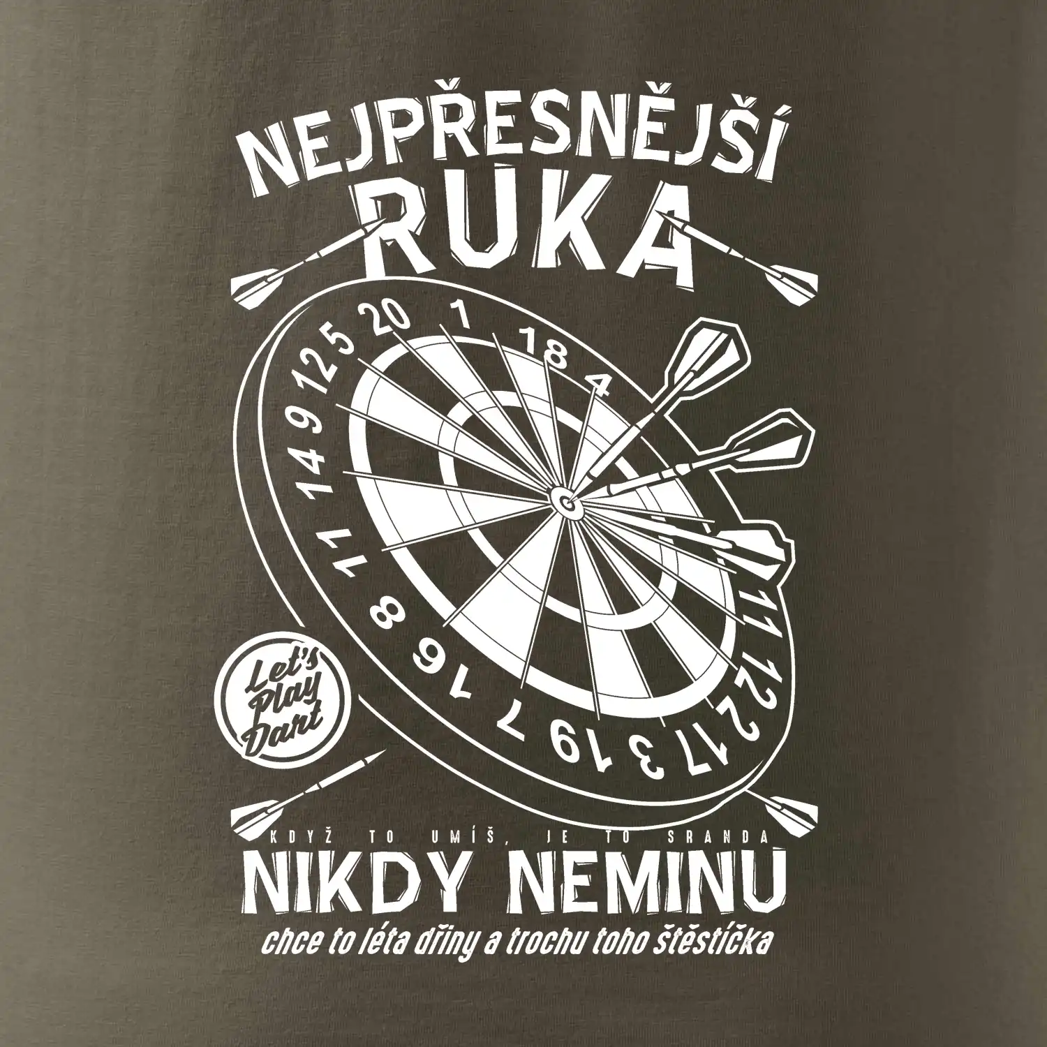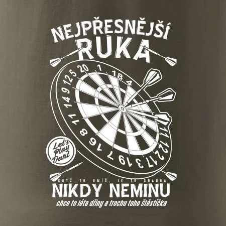Šipkařské triko na zápas nebo oslavu! Když na šipky, tak nesmíš zapomenout triko pro šipkaře. Šipky vyžadují správné triko, které Vám přinese štěstí! Šťastné triko na šipky. Tričko "Nejpřesnější ruka" jako dárek pro šipkaře nebo pro celý šipkařský tým. Šipky už nejsou zdaleka jen hospodská hra, ale opravdový sport, šipkařský dres je základ správného týmu. Tričko pro sportovce, který hraje šipky a každá jeho šipka trefí terč.