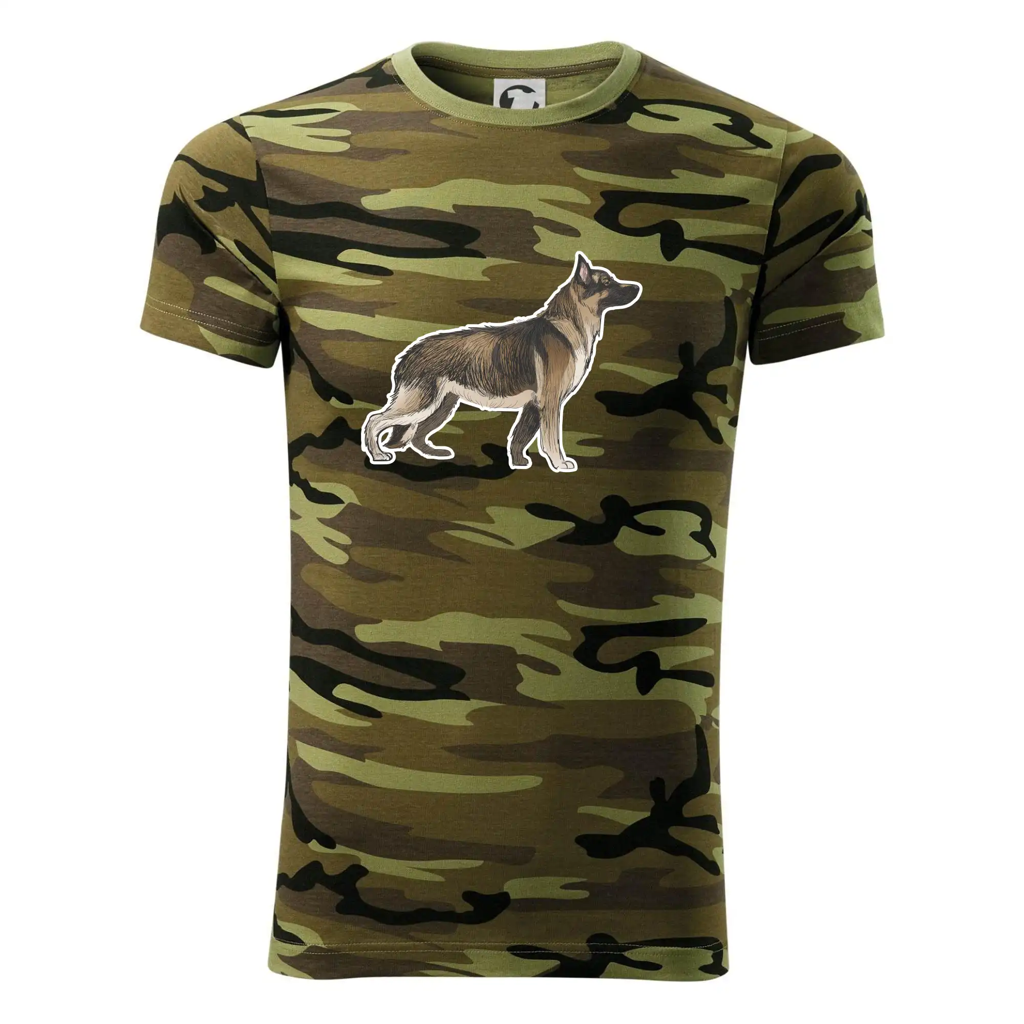 Tričko střední gramáže v barvách camouflage. Střih s bočními švy. Lem průkrčníku ze žebrového úpletu s přídavkem 5 % elastanu. Vnitřní část zadního průkrčníku začištěna páskou v barvě camouflage.