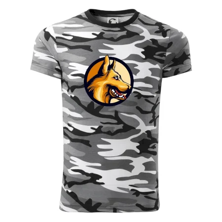 Tričko střední gramáže v barvách camouflage. Střih s bočními švy. Lem průkrčníku ze žebrového úpletu s přídavkem 5 % elastanu. Vnitřní část zadního průkrčníku začištěna páskou v barvě camouflage.