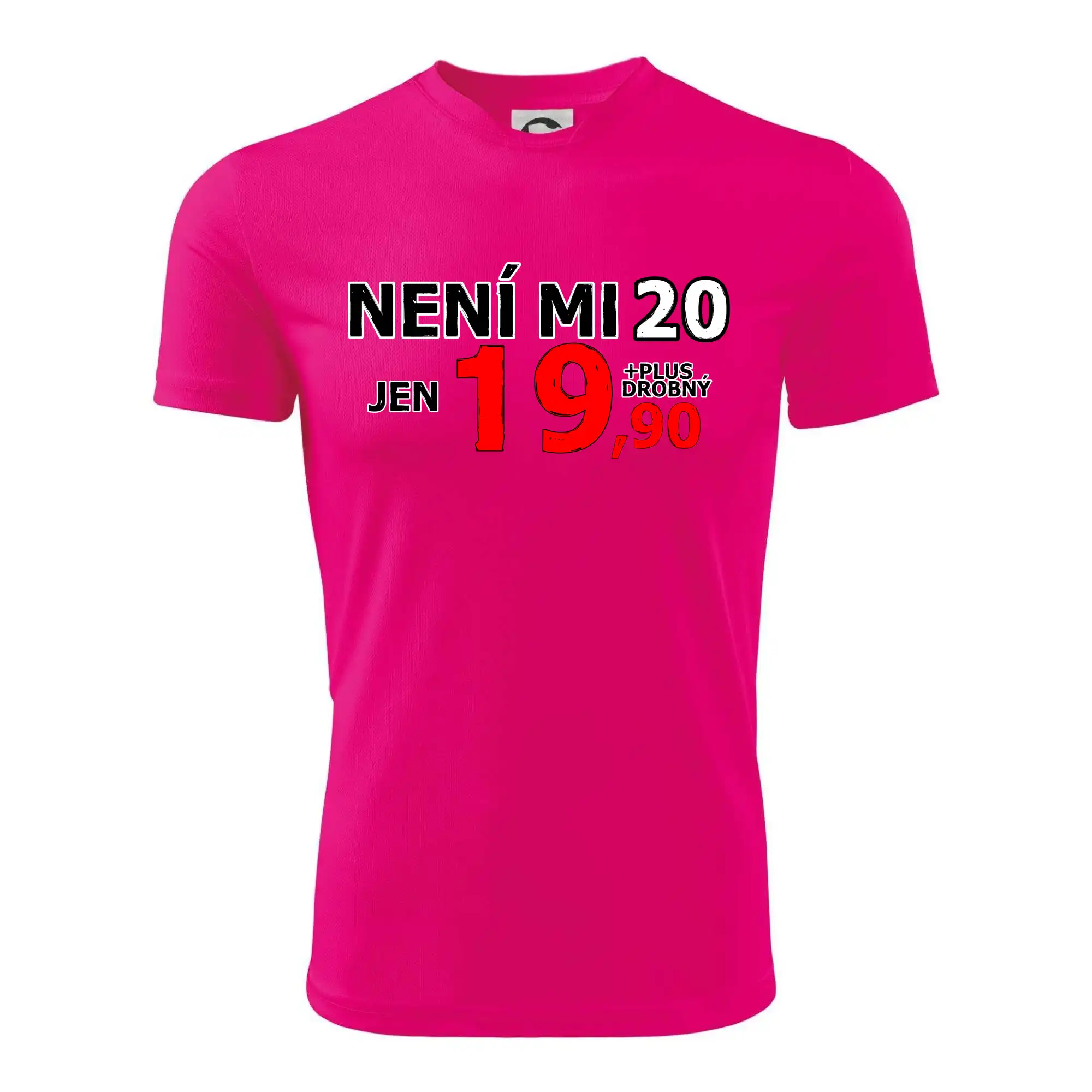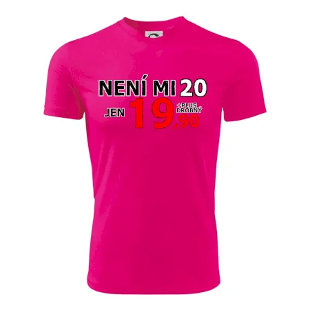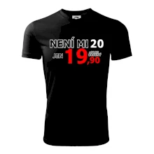 Triko s motivem "Není mi 20, jen 19,90 plus drobný". Narozeninové triko pro oslavence, který oslaví jubileum 20 let, ale připadá si mladší. Dárek ke dvacátinám. Triko ke dvacátým narozeninám.