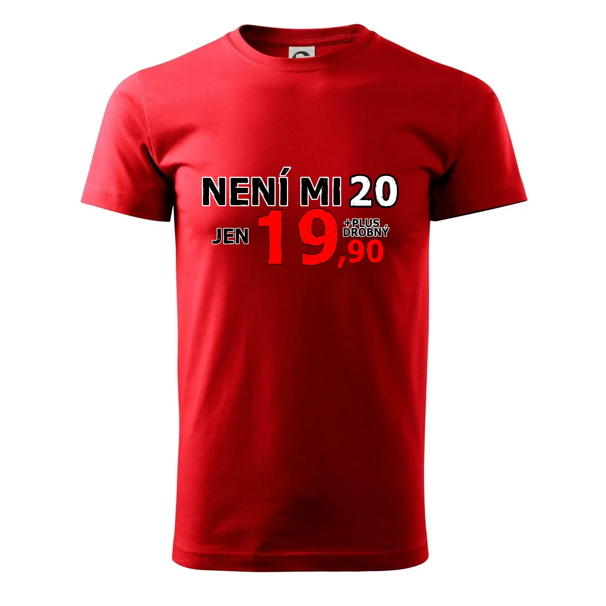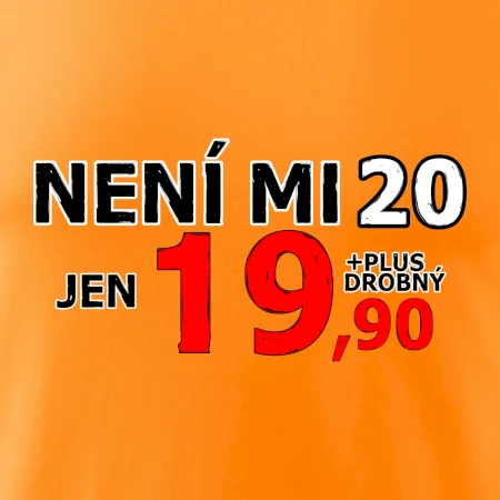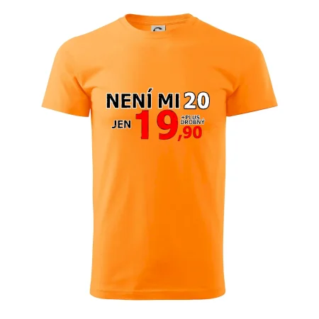 Triko s motivem "Není mi 20, jen 19,90 plus drobný". Narozeninové triko pro oslavence, který oslaví jubileum 20 let, ale připadá si mladší. Dárek ke dvacátinám. Triko ke dvacátým narozeninám.