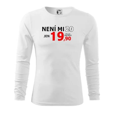Triko s motivem "Není mi 20, jen 19,90 plus drobný". Narozeninové triko pro oslavence, který oslaví jubileum 20 let, ale připadá si mladší. Dárek ke dvacátinám. Triko ke dvacátým narozeninám.