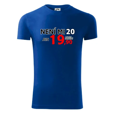 Triko s motivem "Není mi 20, jen 19,90 plus drobný". Narozeninové triko pro oslavence, který oslaví jubileum 20 let, ale připadá si mladší. Dárek ke dvacátinám. Triko ke dvacátým narozeninám.
