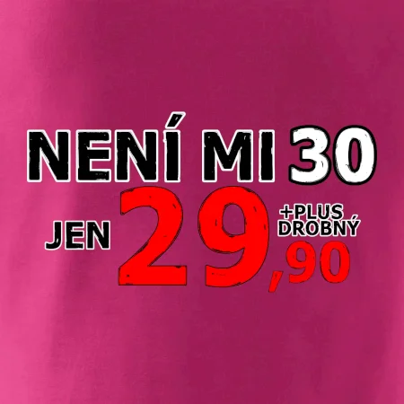 Triko s motivem "Není mi 30, jen 29,90 plus drobný". Narozeninové triko pro oslavence, který oslaví jubileum 30 let, ale připadá si mladší. Dárek ke třicátinám. Triko ke třicátým narozeninám.