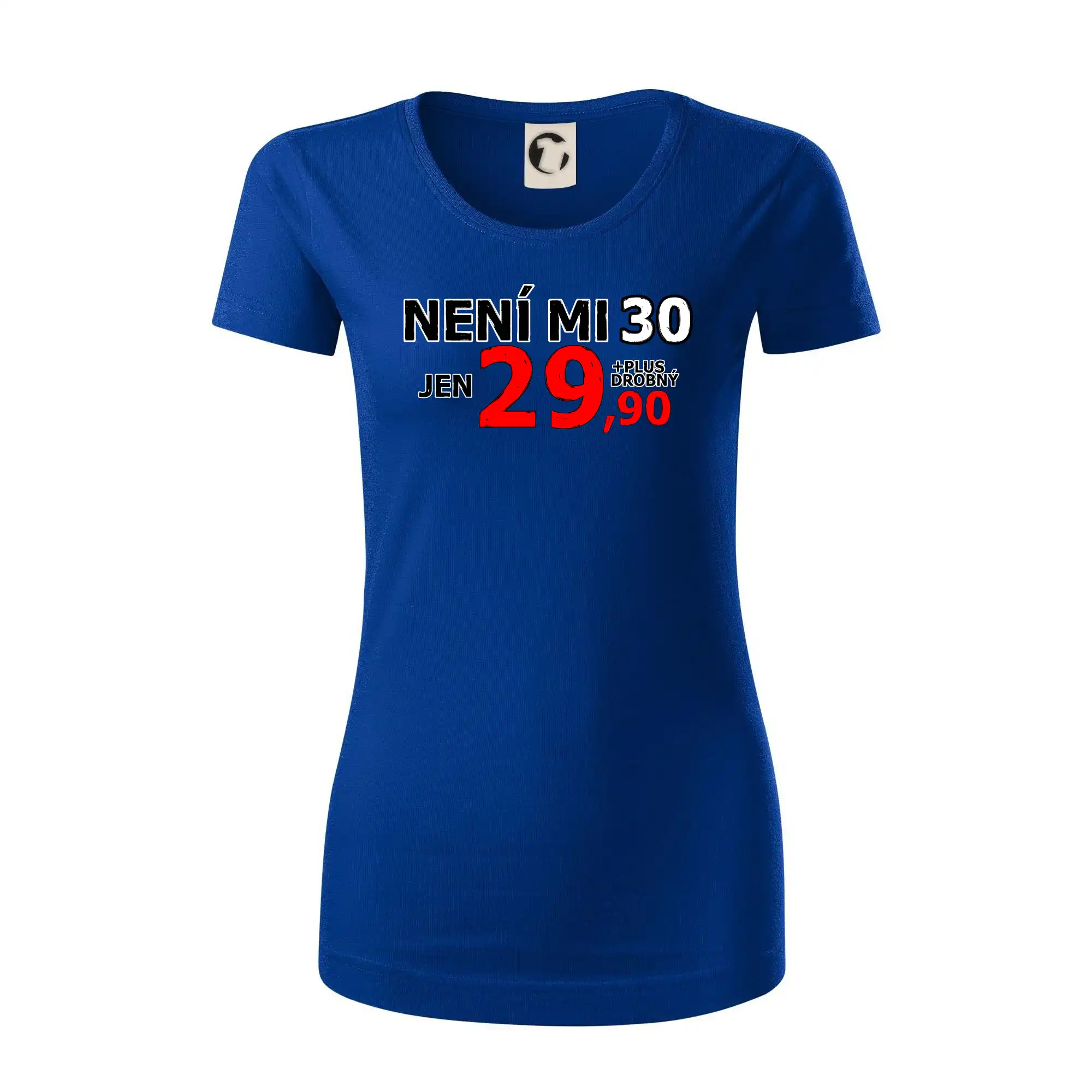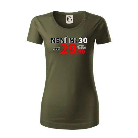 Triko s motivem "Není mi 30, jen 29,90 plus drobný". Narozeninové triko pro oslavence, který oslaví jubileum 30 let, ale připadá si mladší. Dárek ke třicátinám. Triko ke třicátým narozeninám.