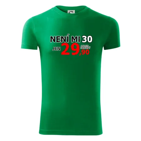 Triko s motivem "Není mi 30, jen 29,90 plus drobný". Narozeninové triko pro oslavence, který oslaví jubileum 30 let, ale připadá si mladší. Dárek ke třicátinám. Triko ke třicátým narozeninám.