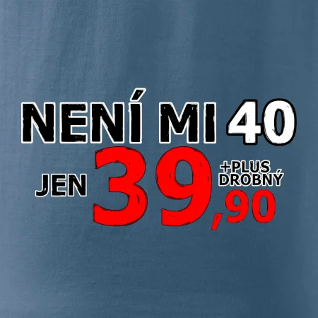 Triko s motivem "Není mi 40, jen 39,90 plus drobný". Narozeninové triko pro oslavence, který oslaví jubileum 40 let, ale připadá si mladší. Dárek ke čtyřicátinám. Triko ke čtyřicátým narozeninám.