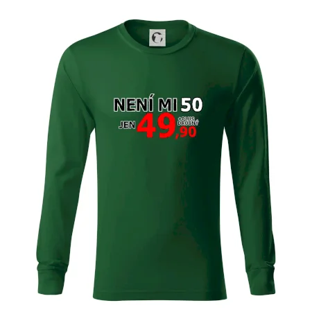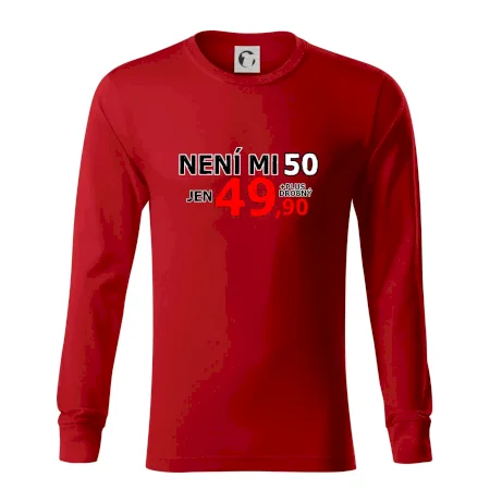 Triko s motivem "Není mi 50, jen 49,90 plus drobný". Narozeninové triko pro oslavence, který oslaví jubileum 50 let, ale připadá si mladší. Dárek k padesátinám. Triko k padesátým narozeninám.