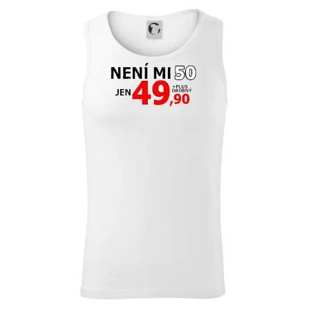 Triko s motivem "Není mi 50, jen 49,90 plus drobný". Narozeninové triko pro oslavence, který oslaví jubileum 50 let, ale připadá si mladší. Dárek k padesátinám. Triko k padesátým narozeninám.