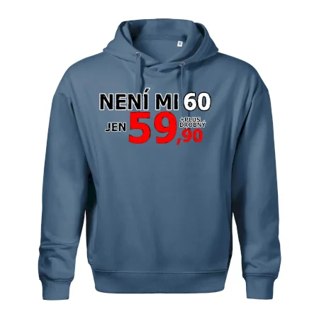 Triko s motivem "Není mi 60, jen 59,90 plus drobný". Narozeninové triko pro oslavence, který oslaví jubileum 60 let, ale připadá si mladší. Dárek k šedesátinám. Triko k šedesátým narozeninám.