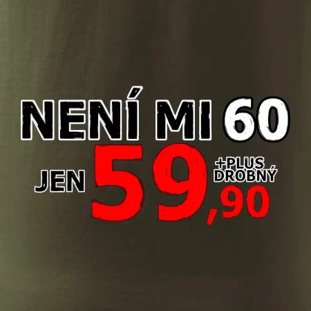 Triko s motivem "Není mi 60, jen 59,90 plus drobný". Narozeninové triko pro oslavence, který oslaví jubileum 60 let, ale připadá si mladší. Dárek k šedesátinám. Triko k šedesátým narozeninám.