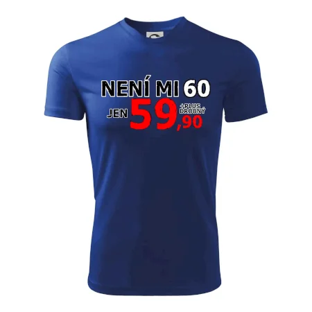 Triko s motivem "Není mi 60, jen 59,90 plus drobný". Narozeninové triko pro oslavence, který oslaví jubileum 60 let, ale připadá si mladší. Dárek k šedesátinám. Triko k šedesátým narozeninám.