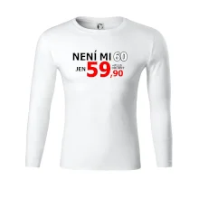 Triko s motivem "Není mi 60, jen 59,90 plus drobný". Narozeninové triko pro oslavence, který oslaví jubileum 60 let, ale připadá si mladší. Dárek k šedesátinám. Triko k šedesátým narozeninám.