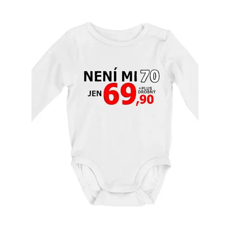 Triko s motivem "Není mi 70, jen 69,90 plus drobný". Narozeninové triko pro oslavence, který oslaví jubileum 70 let, ale připadá si mladší. Dárek k sedmdesátinám. Triko k sedmdesátým narozeninám.