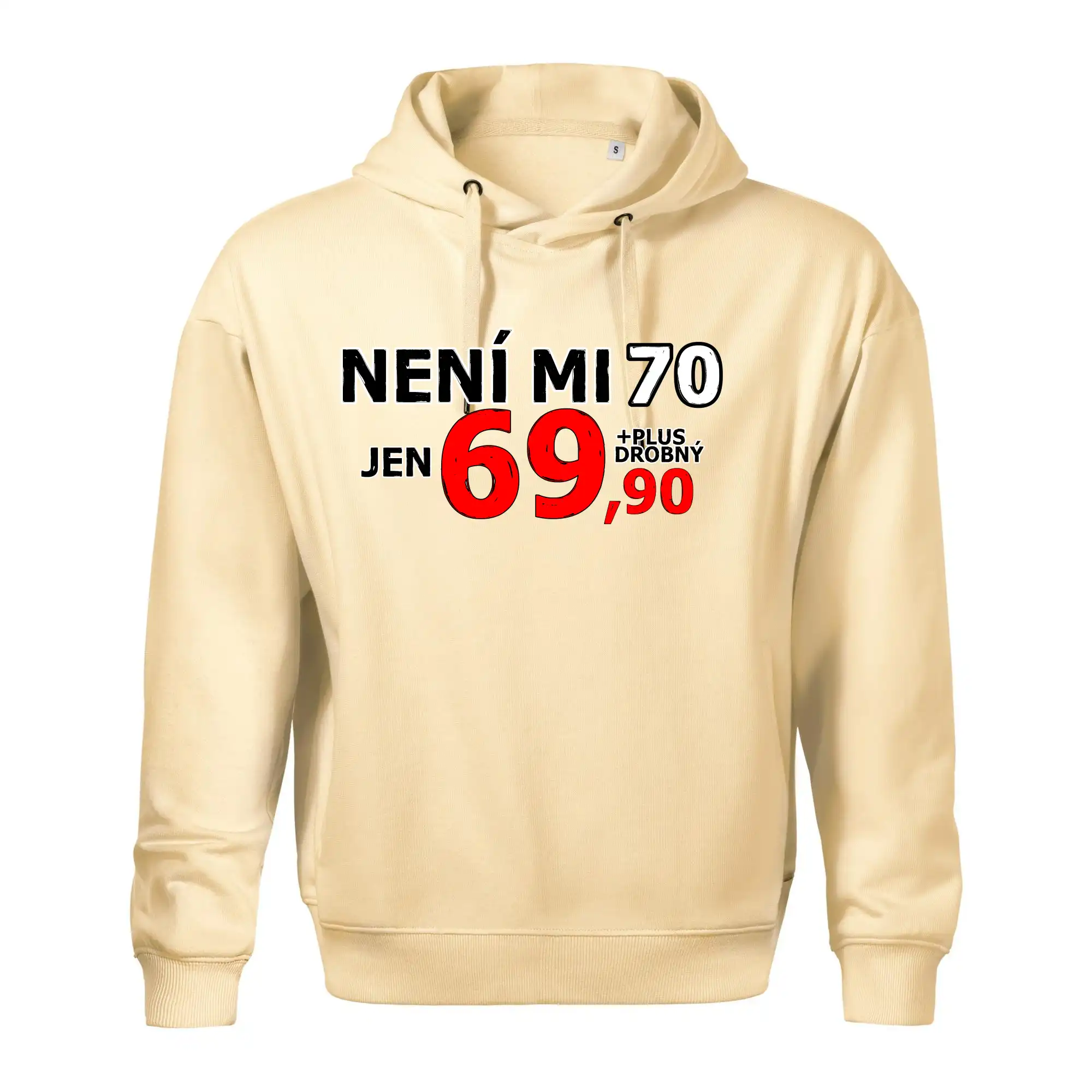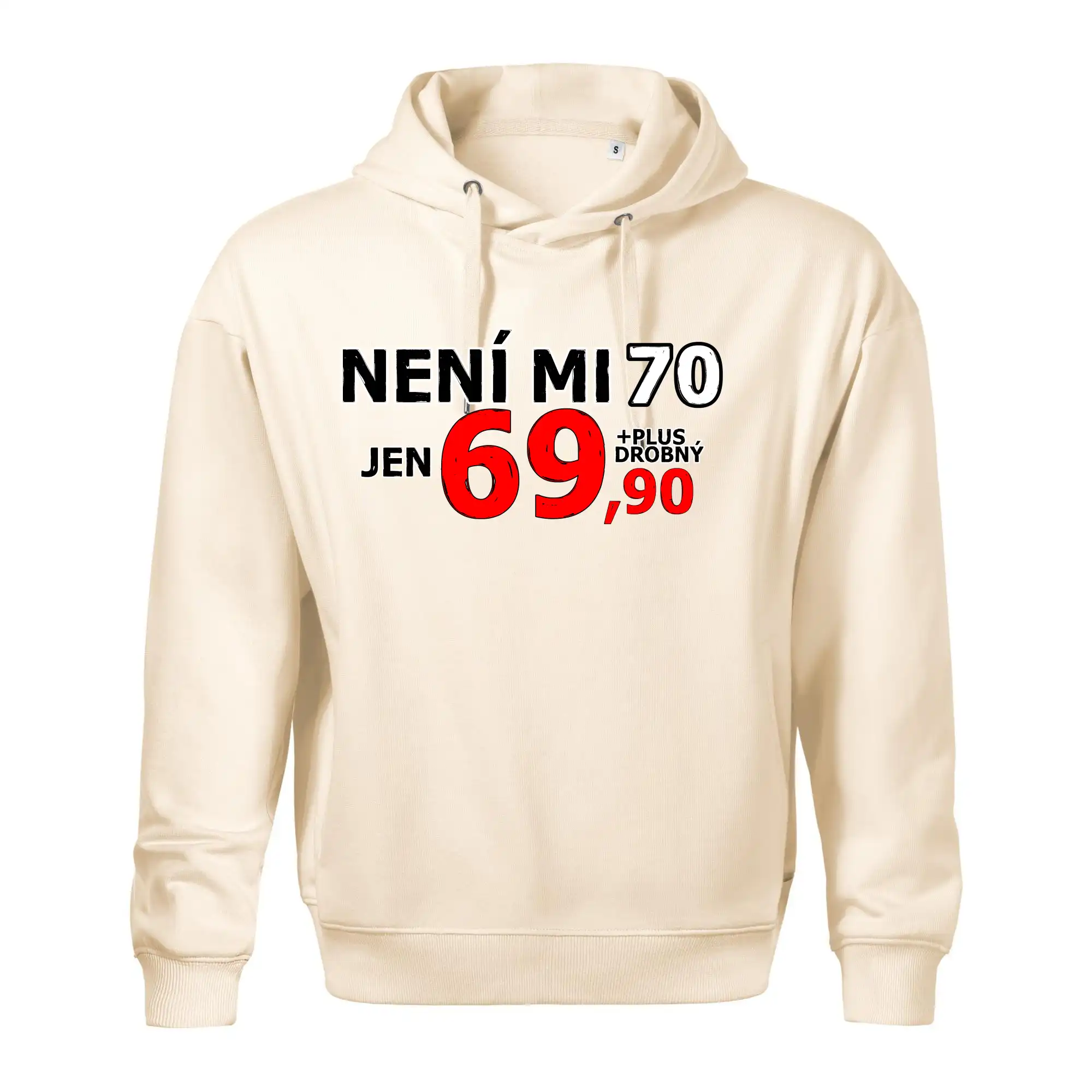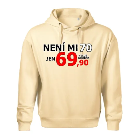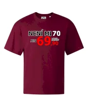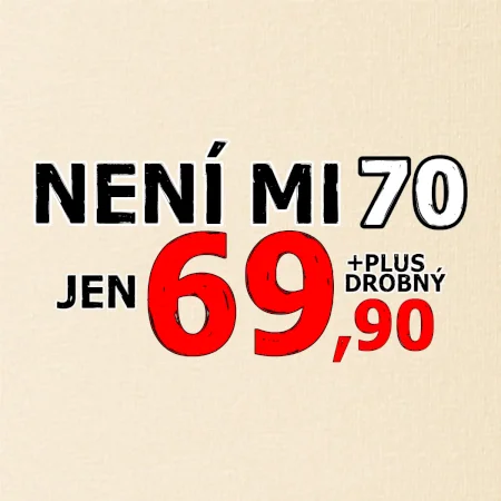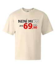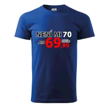 Triko s motivem "Není mi 70, jen 69,90 plus drobný". Narozeninové triko pro oslavence, který oslaví jubileum 70 let, ale připadá si mladší. Dárek k sedmdesátinám. Triko k sedmdesátým narozeninám.