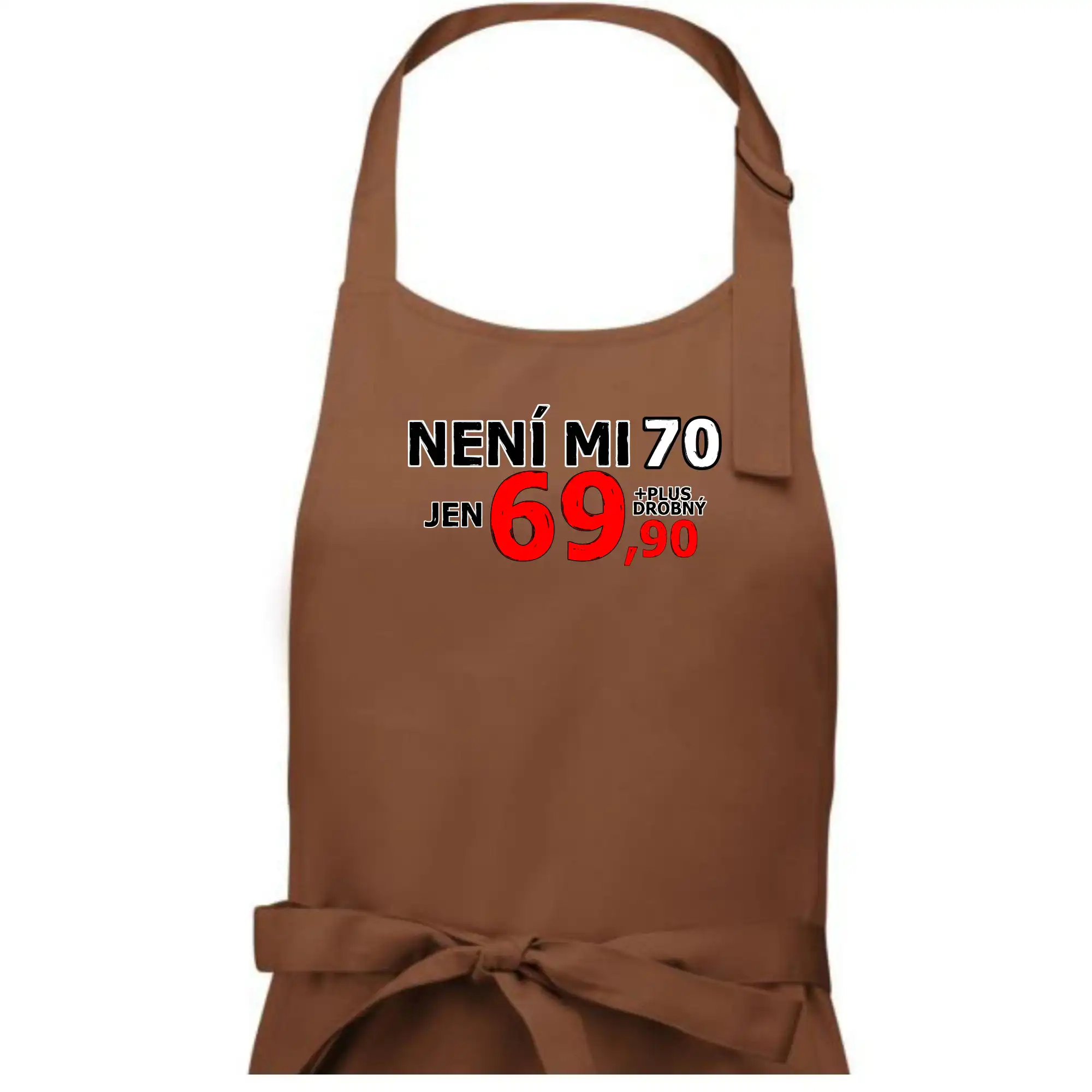 Triko s motivem "Není mi 70, jen 69,90 plus drobný". Narozeninové triko pro oslavence, který oslaví jubileum 70 let, ale připadá si mladší. Dárek k sedmdesátinám. Triko k sedmdesátým narozeninám.