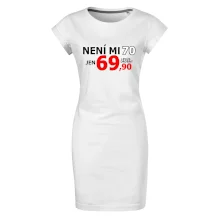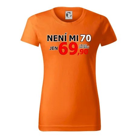 Triko s motivem "Není mi 70, jen 69,90 plus drobný". Narozeninové triko pro oslavence, který oslaví jubileum 70 let, ale připadá si mladší. Dárek k sedmdesátinám. Triko k sedmdesátým narozeninám.