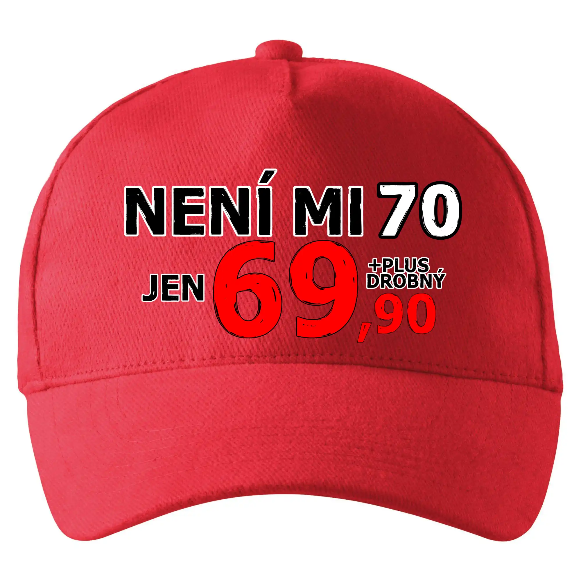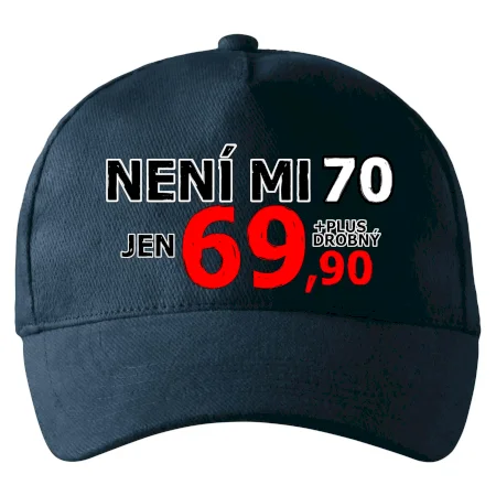 Triko s motivem "Není mi 70, jen 69,90 plus drobný". Narozeninové triko pro oslavence, který oslaví jubileum 70 let, ale připadá si mladší. Dárek k sedmdesátinám. Triko k sedmdesátým narozeninám.