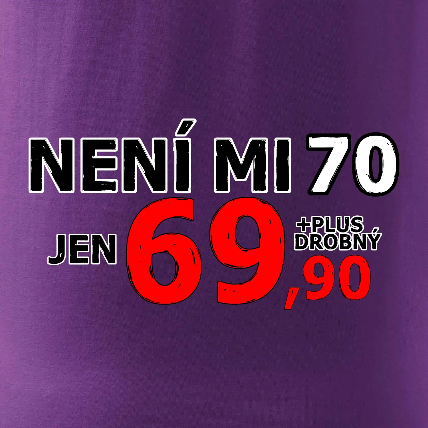 Triko s motivem "Není mi 70, jen 69,90 plus drobný". Narozeninové triko pro oslavence, který oslaví jubileum 70 let, ale připadá si mladší. Dárek k sedmdesátinám. Triko k sedmdesátým narozeninám.