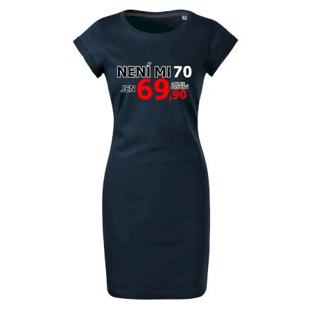 Triko s motivem "Není mi 70, jen 69,90 plus drobný". Narozeninové triko pro oslavence, který oslaví jubileum 70 let, ale připadá si mladší. Dárek k sedmdesátinám. Triko k sedmdesátým narozeninám.