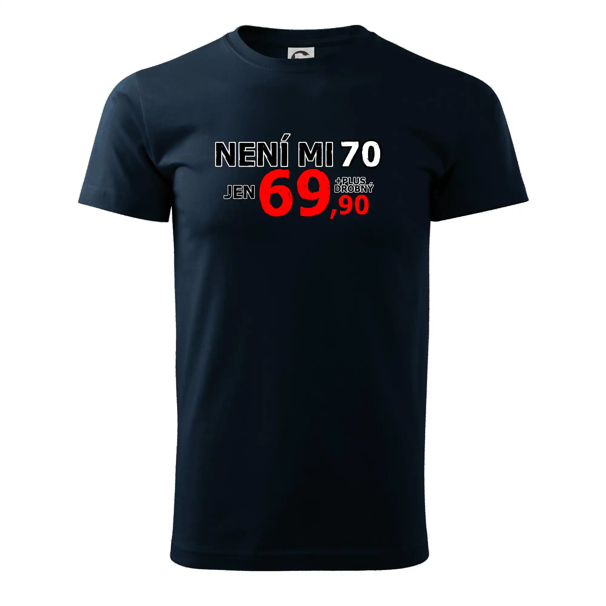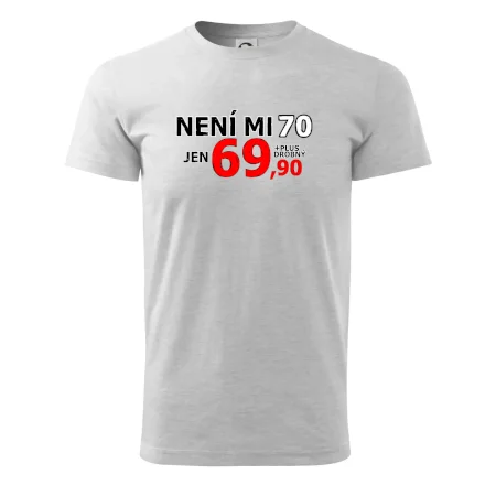 Triko s motivem "Není mi 70, jen 69,90 plus drobný". Narozeninové triko pro oslavence, který oslaví jubileum 70 let, ale připadá si mladší. Dárek k sedmdesátinám. Triko k sedmdesátým narozeninám.