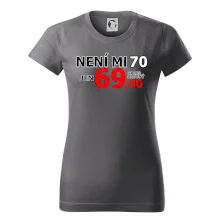 Triko s motivem "Není mi 70, jen 69,90 plus drobný". Narozeninové triko pro oslavence, který oslaví jubileum 70 let, ale připadá si mladší. Dárek k sedmdesátinám. Triko k sedmdesátým narozeninám.