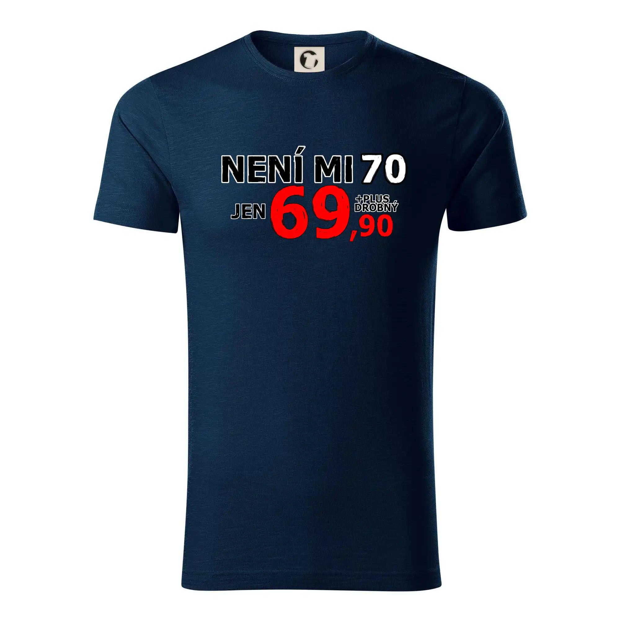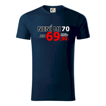 Triko s motivem "Není mi 70, jen 69,90 plus drobný". Narozeninové triko pro oslavence, který oslaví jubileum 70 let, ale připadá si mladší. Dárek k sedmdesátinám. Triko k sedmdesátým narozeninám.