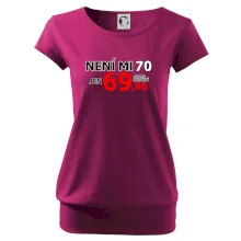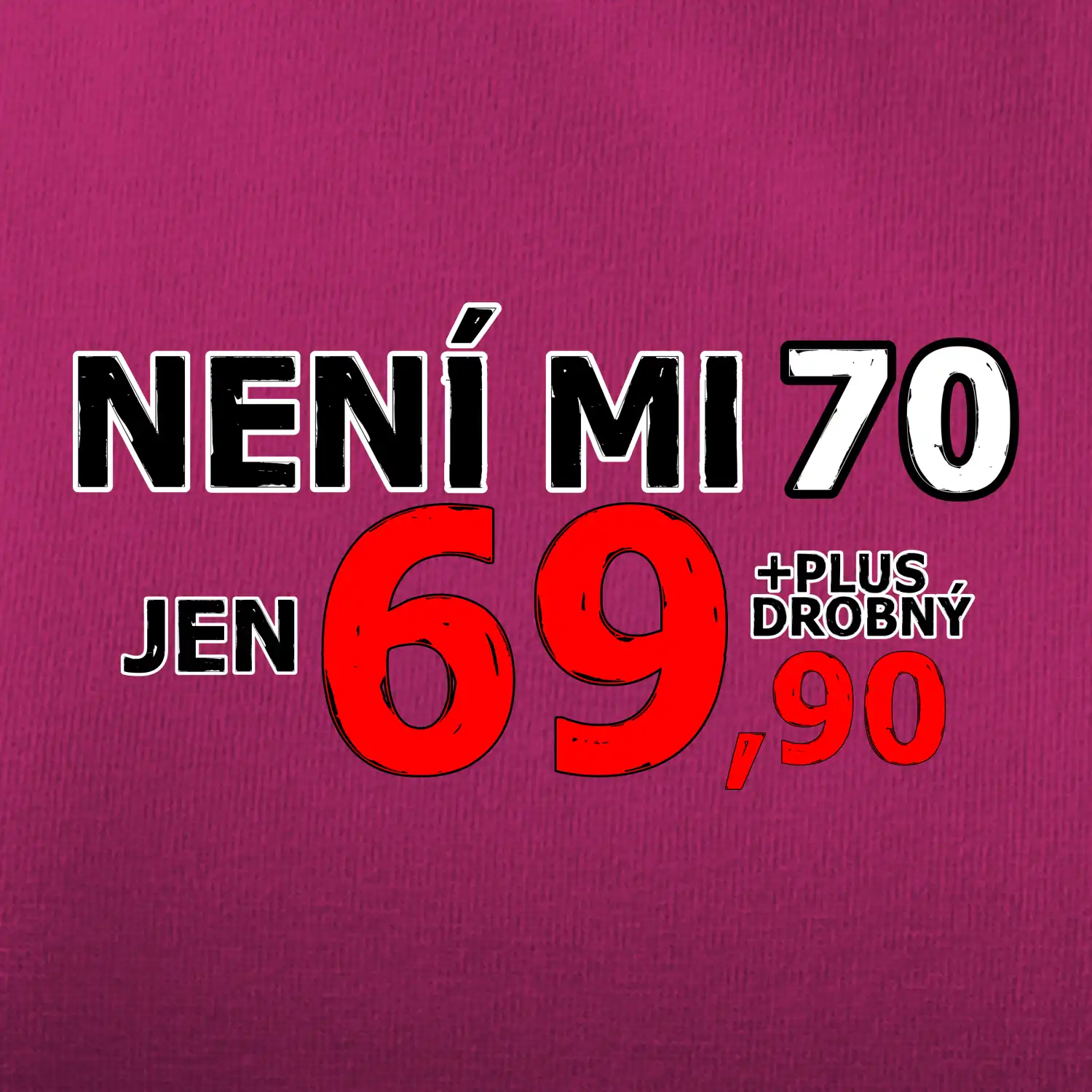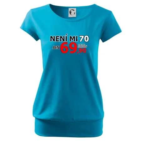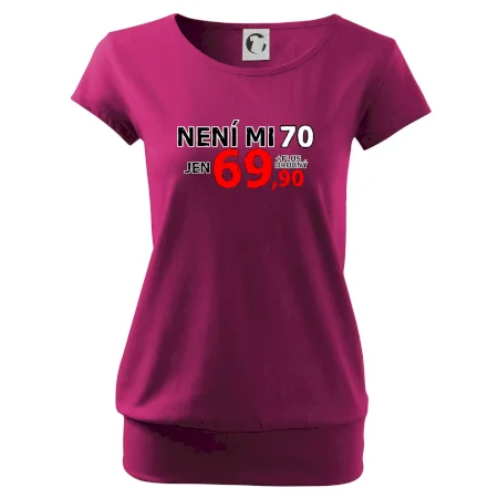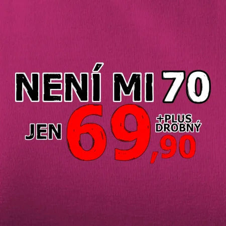 Triko s motivem "Není mi 70, jen 69,90 plus drobný". Narozeninové triko pro oslavence, který oslaví jubileum 70 let, ale připadá si mladší. Dárek k sedmdesátinám. Triko k sedmdesátým narozeninám.