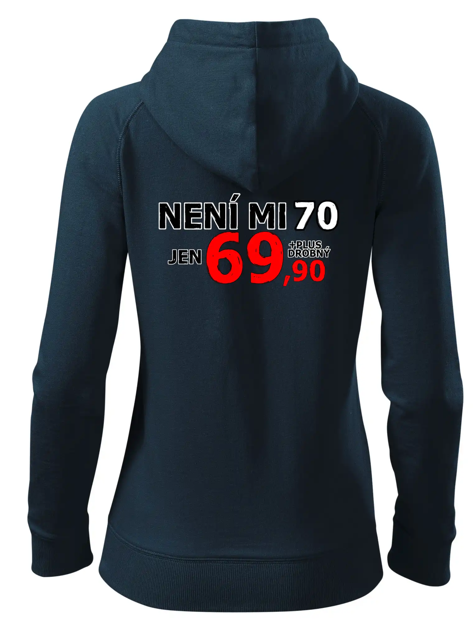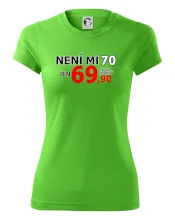 Triko s motivem "Není mi 70, jen 69,90 plus drobný". Narozeninové triko pro oslavence, který oslaví jubileum 70 let, ale připadá si mladší. Dárek k sedmdesátinám. Triko k sedmdesátým narozeninám.
