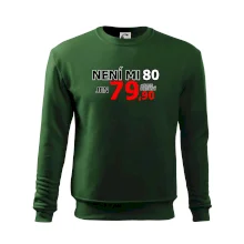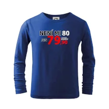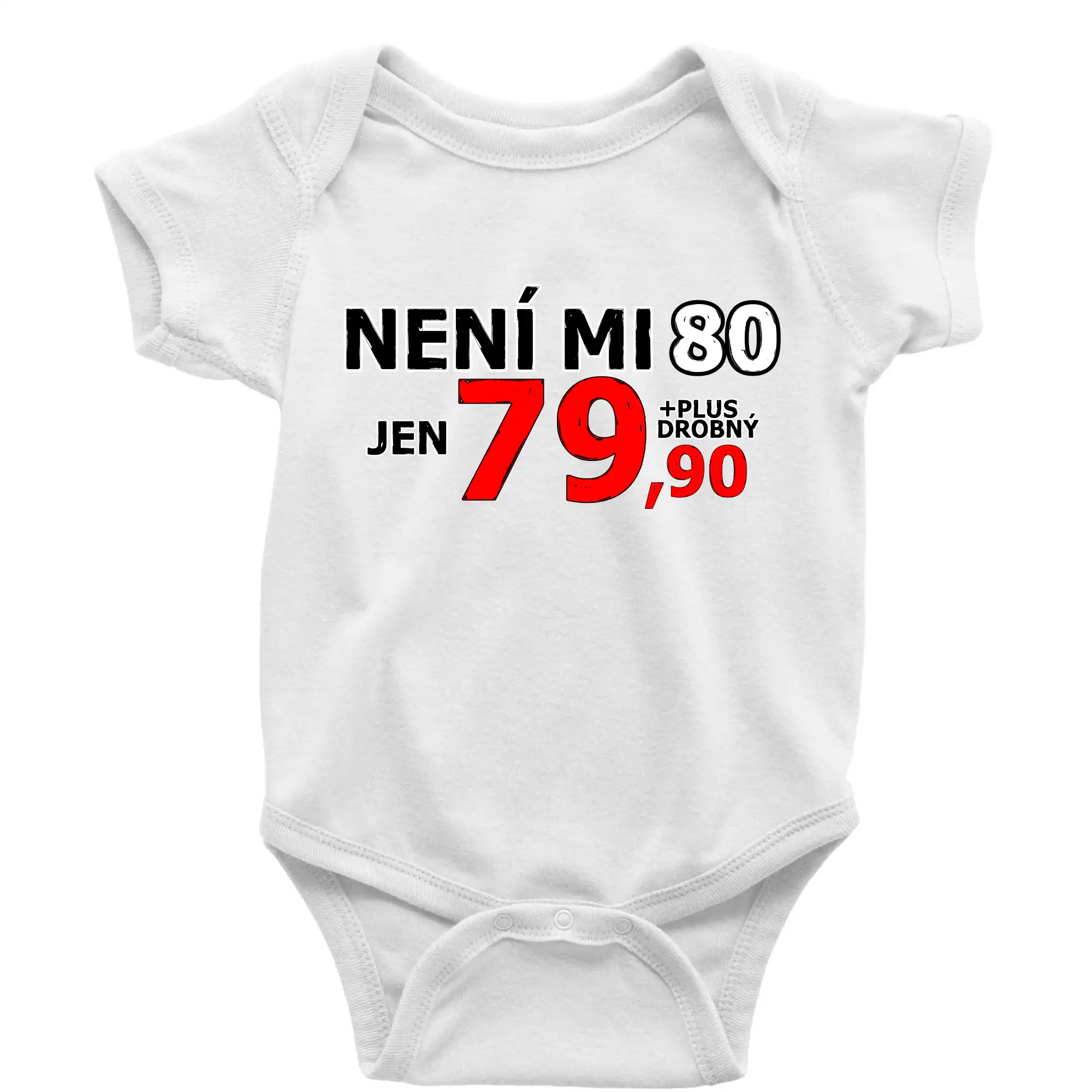 Triko s motivem "Není mi 80, jen 79,90 plus drobný". Narozeninové triko pro oslavence, který oslaví jubileum 80 let, ale připadá si mladší. Dárek k osmdesátinám. Triko k osmdesátým narozeninám.