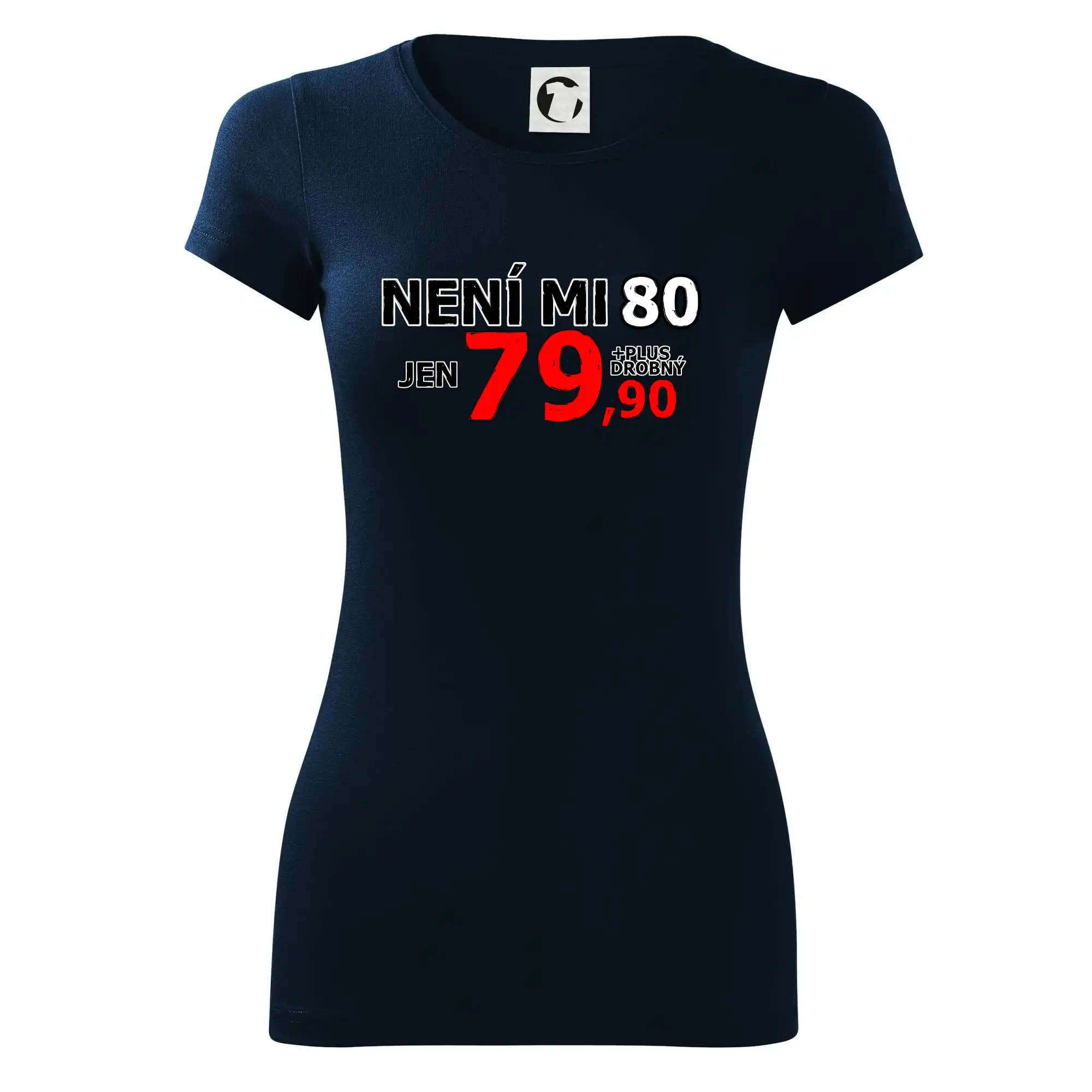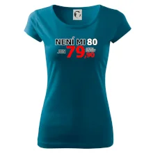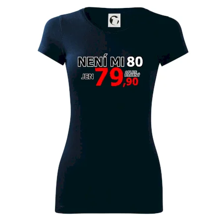 Triko s motivem "Není mi 80, jen 79,90 plus drobný". Narozeninové triko pro oslavence, který oslaví jubileum 80 let, ale připadá si mladší. Dárek k osmdesátinám. Triko k osmdesátým narozeninám.