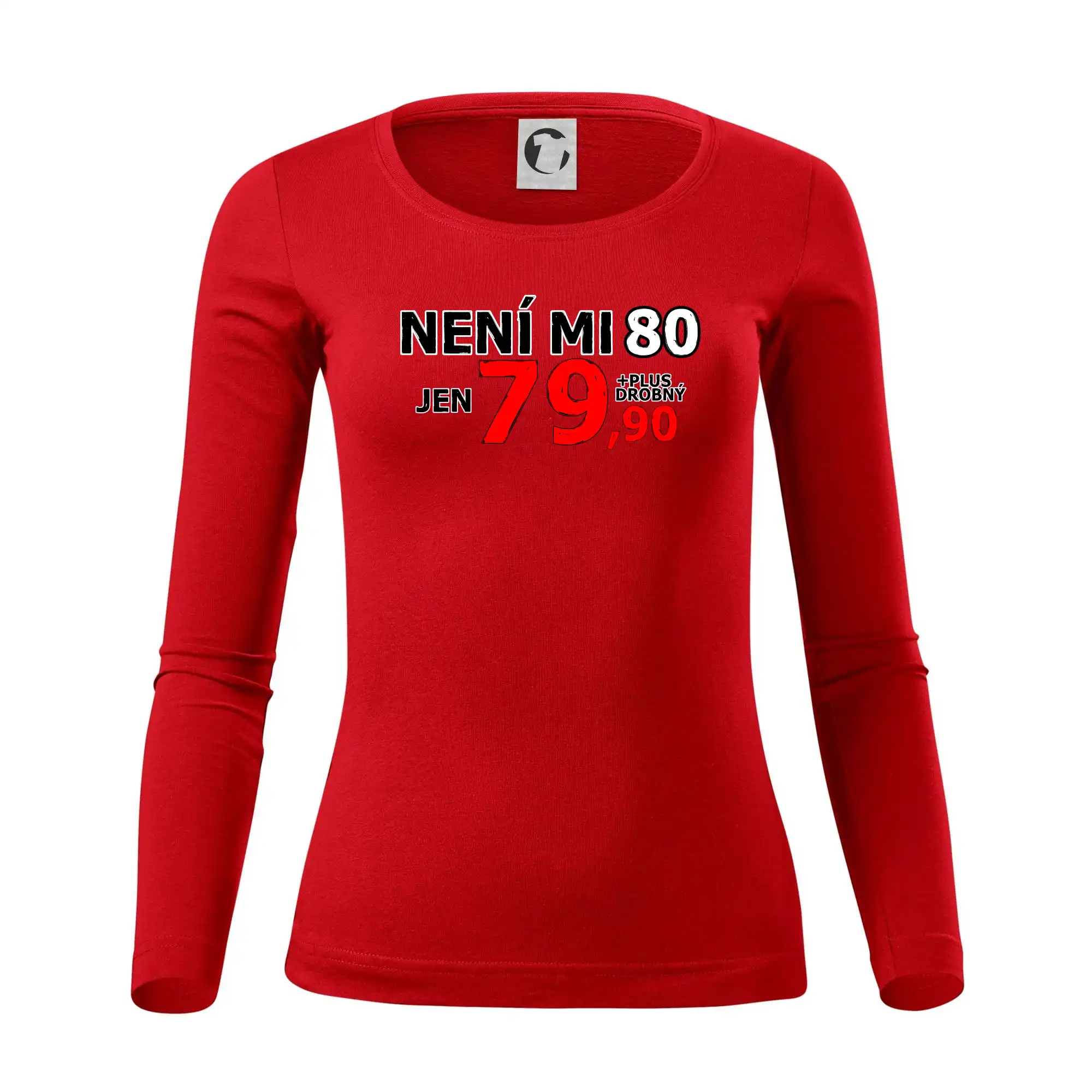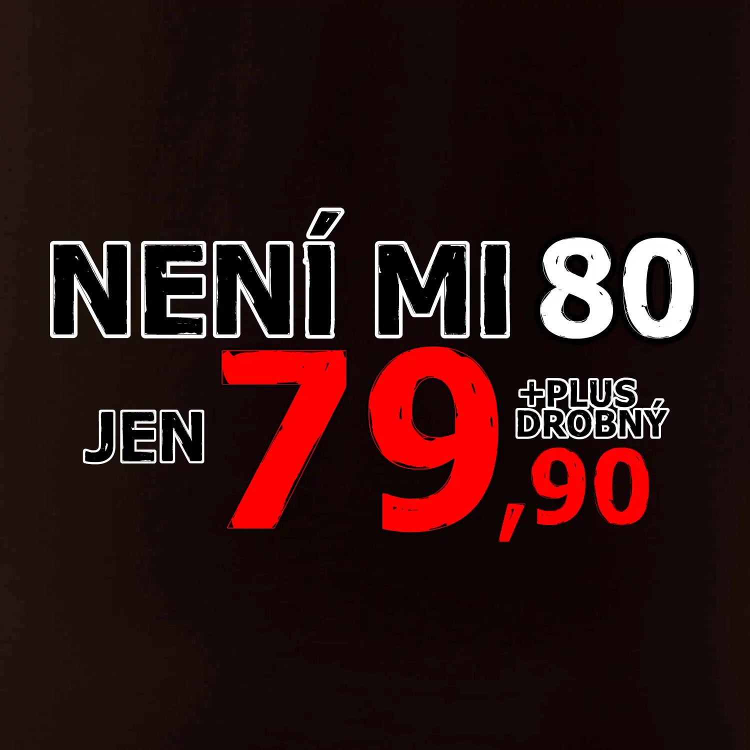 Triko s motivem "Není mi 80, jen 79,90 plus drobný". Narozeninové triko pro oslavence, který oslaví jubileum 80 let, ale připadá si mladší. Dárek k osmdesátinám. Triko k osmdesátým narozeninám.