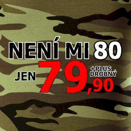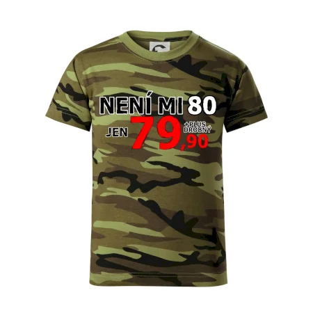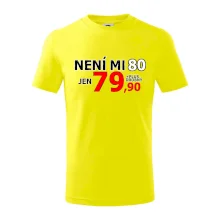 Triko s motivem "Není mi 80, jen 79,90 plus drobný". Narozeninové triko pro oslavence, který oslaví jubileum 80 let, ale připadá si mladší. Dárek k osmdesátinám. Triko k osmdesátým narozeninám.