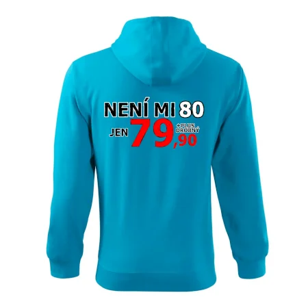 Triko s motivem "Není mi 80, jen 79,90 plus drobný". Narozeninové triko pro oslavence, který oslaví jubileum 80 let, ale připadá si mladší. Dárek k osmdesátinám. Triko k osmdesátým narozeninám.