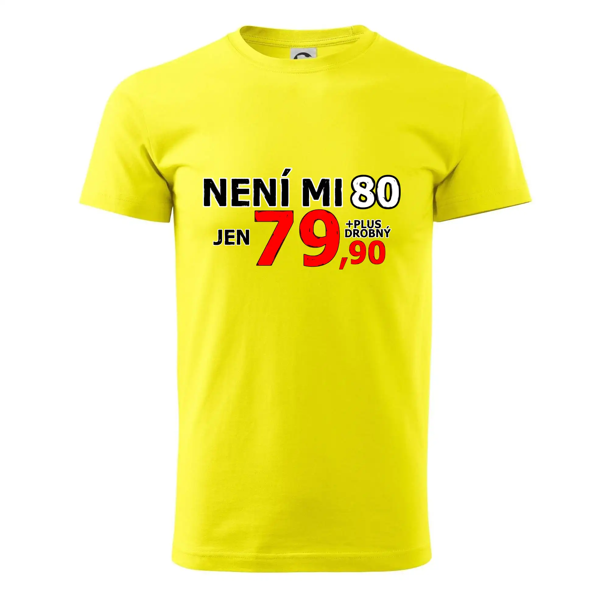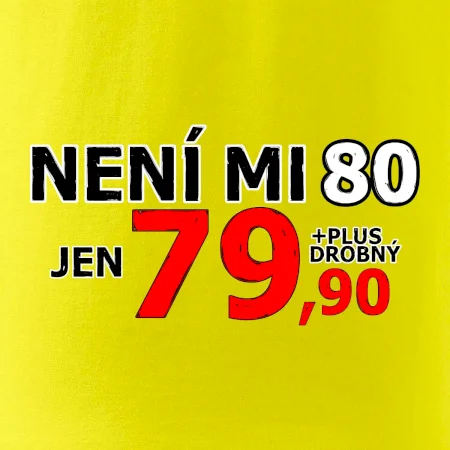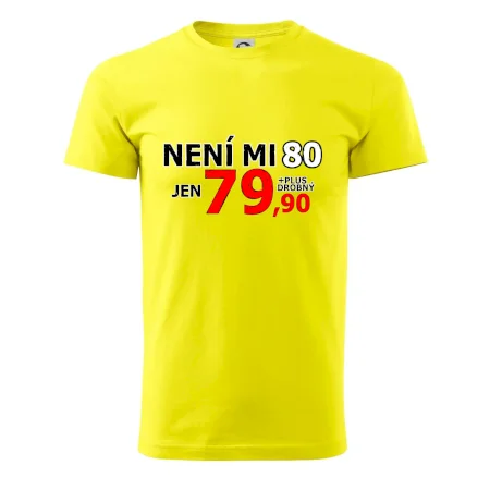 Triko s motivem "Není mi 80, jen 79,90 plus drobný". Narozeninové triko pro oslavence, který oslaví jubileum 80 let, ale připadá si mladší. Dárek k osmdesátinám. Triko k osmdesátým narozeninám.