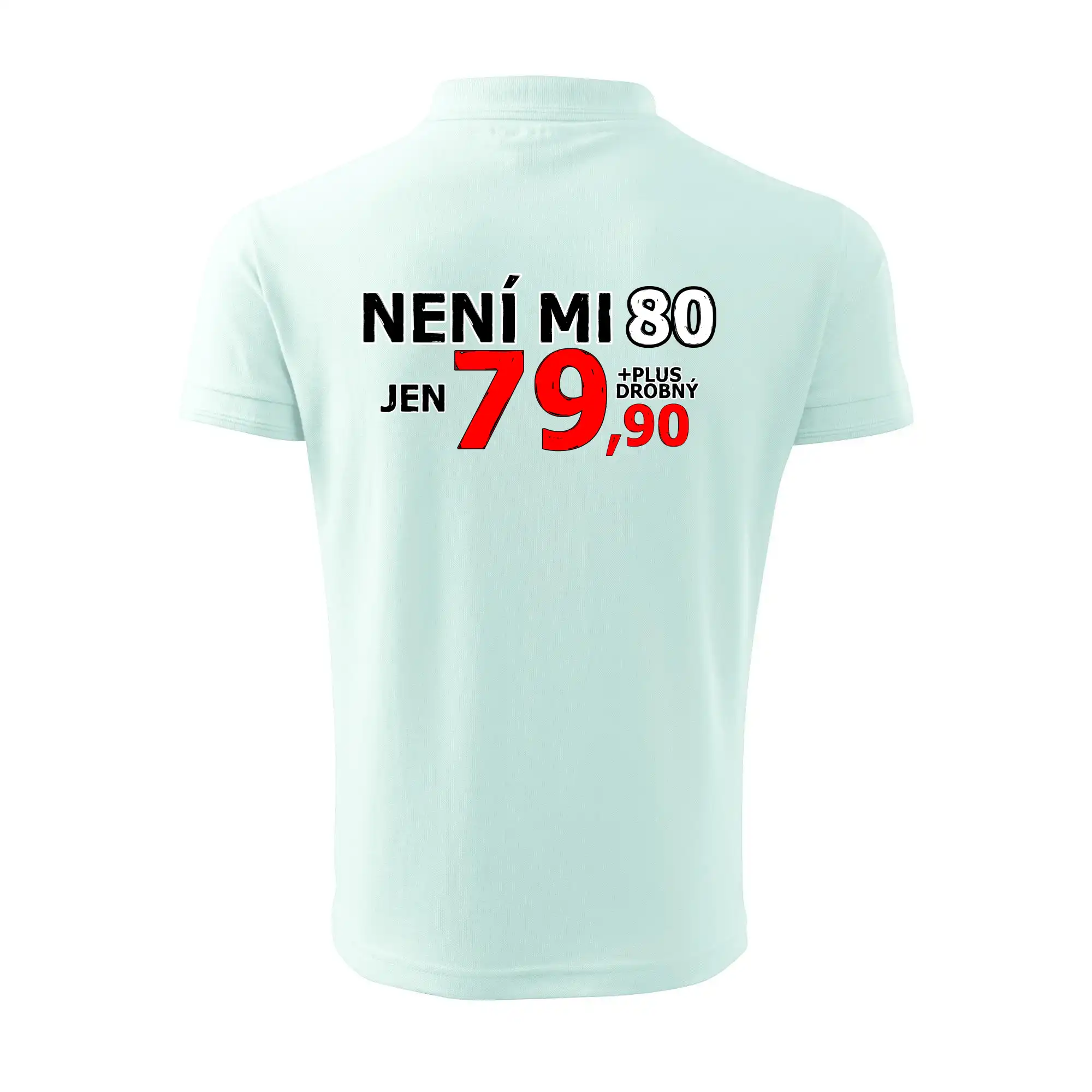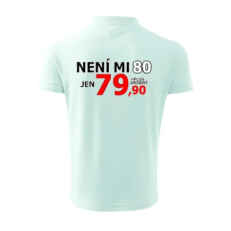 Triko s motivem "Není mi 80, jen 79,90 plus drobný". Narozeninové triko pro oslavence, který oslaví jubileum 80 let, ale připadá si mladší. Dárek k osmdesátinám. Triko k osmdesátým narozeninám.