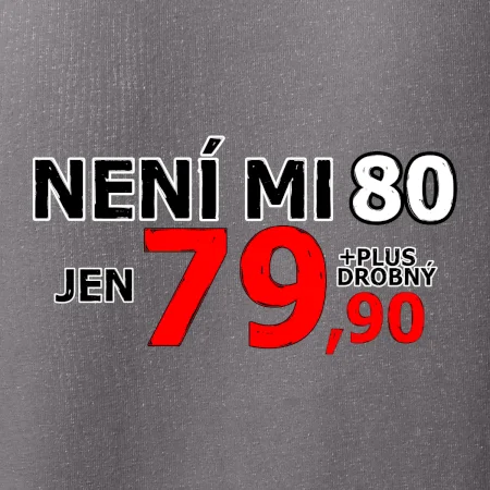 Triko s motivem "Není mi 80, jen 79,90 plus drobný". Narozeninové triko pro oslavence, který oslaví jubileum 80 let, ale připadá si mladší. Dárek k osmdesátinám. Triko k osmdesátým narozeninám.