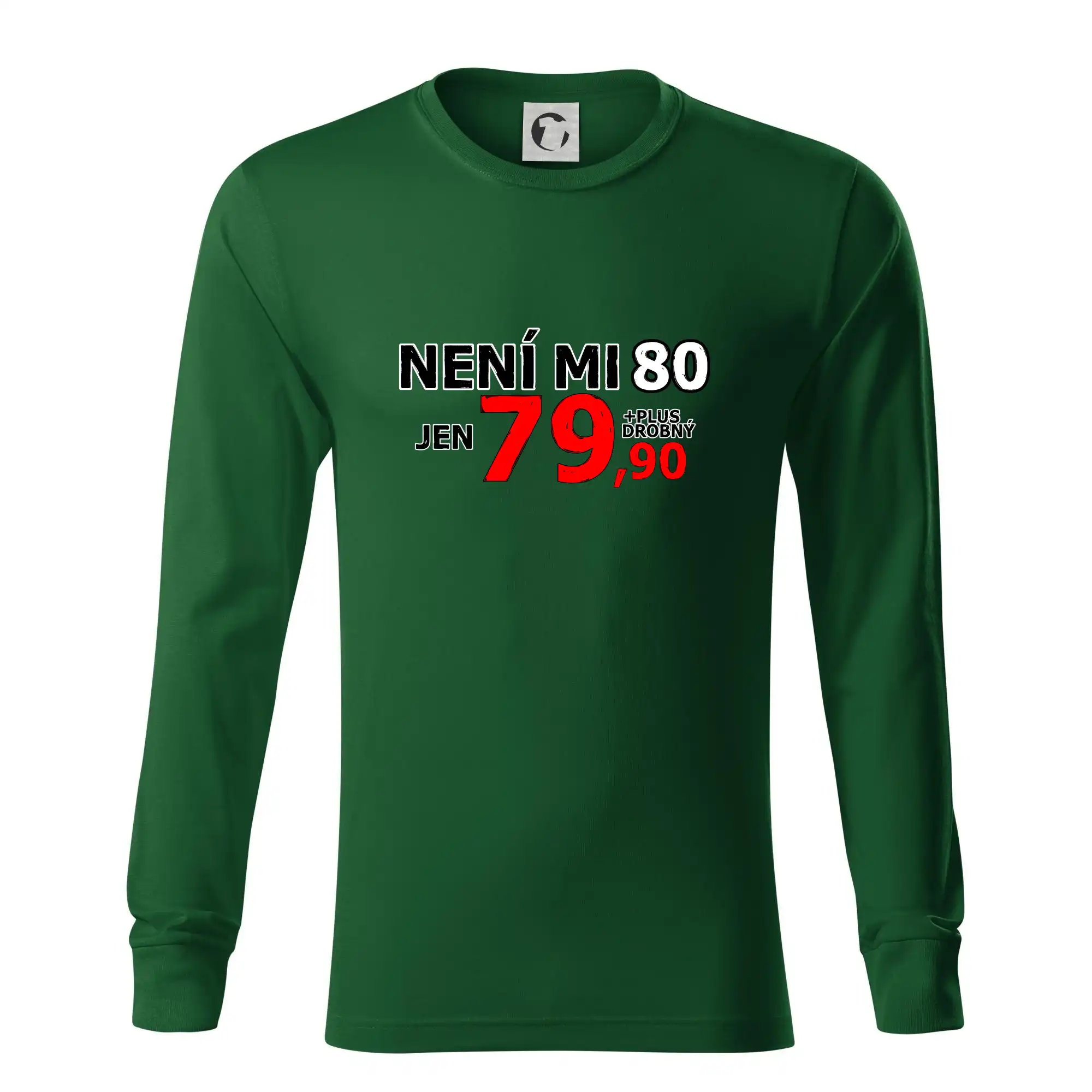 Triko s motivem "Není mi 80, jen 79,90 plus drobný". Narozeninové triko pro oslavence, který oslaví jubileum 80 let, ale připadá si mladší. Dárek k osmdesátinám. Triko k osmdesátým narozeninám.