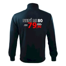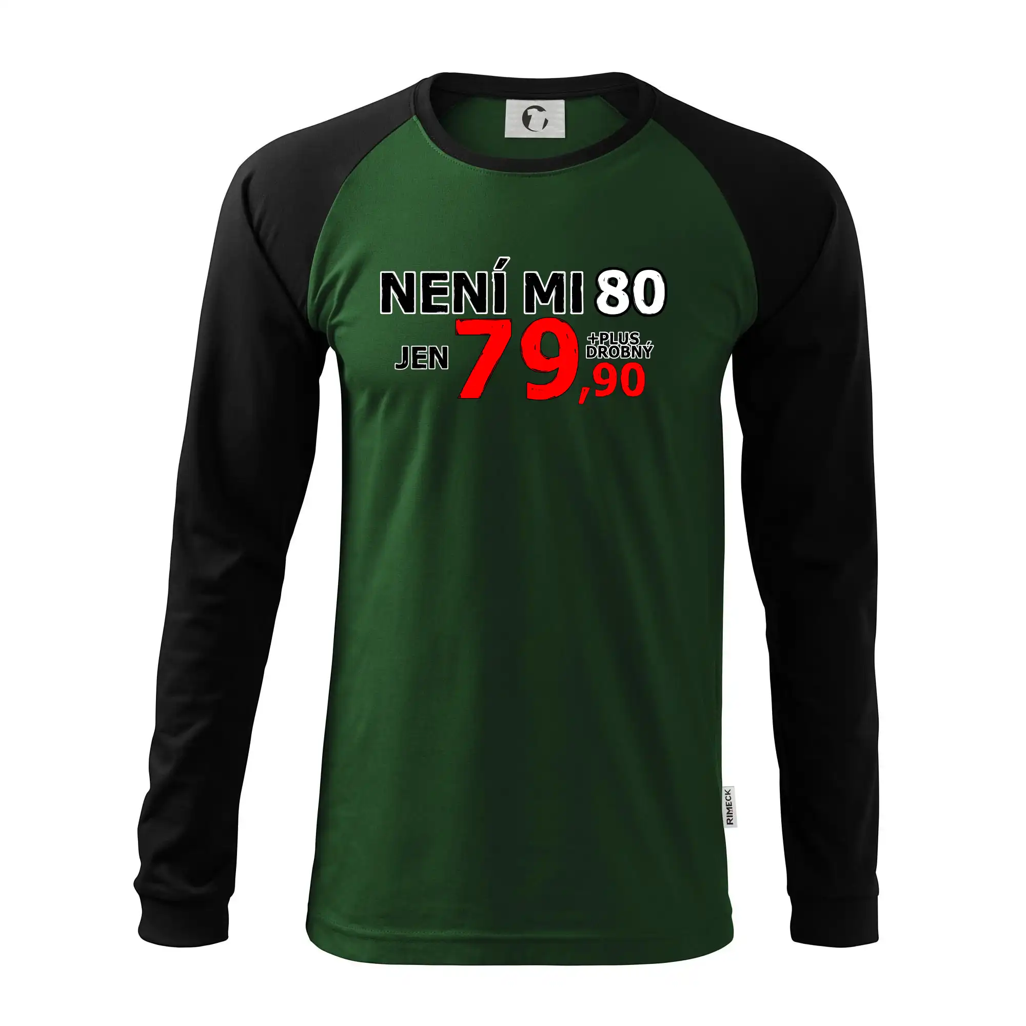Triko s motivem "Není mi 80, jen 79,90 plus drobný". Narozeninové triko pro oslavence, který oslaví jubileum 80 let, ale připadá si mladší. Dárek k osmdesátinám. Triko k osmdesátým narozeninám.