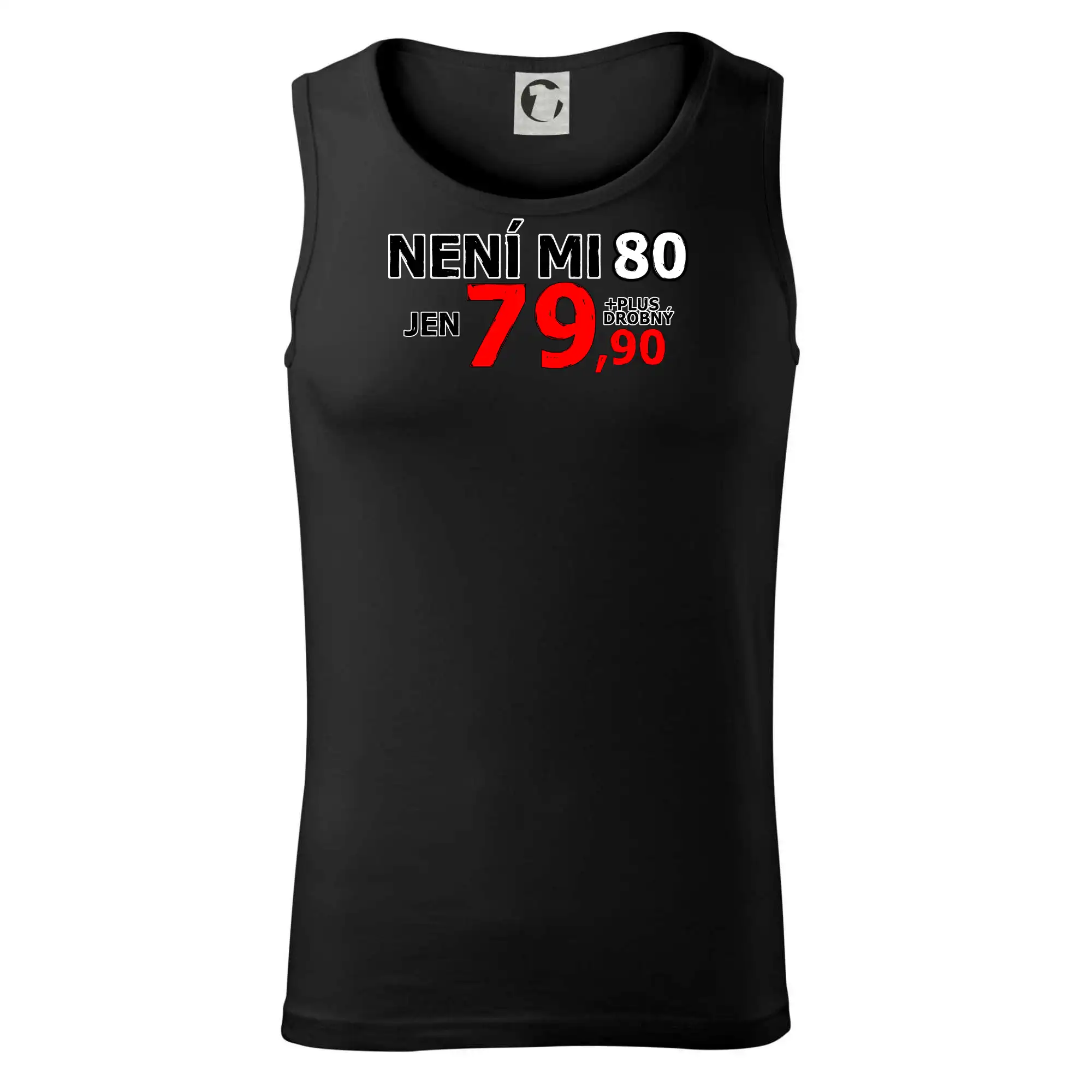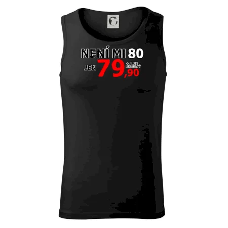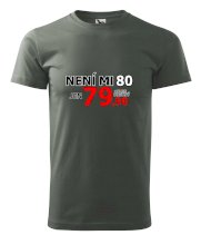 Triko s motivem "Není mi 80, jen 79,90 plus drobný". Narozeninové triko pro oslavence, který oslaví jubileum 80 let, ale připadá si mladší. Dárek k osmdesátinám. Triko k osmdesátým narozeninám.