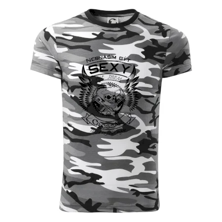 Tričko střední gramáže v barvách camouflage. Střih s bočními švy. Lem průkrčníku ze žebrového úpletu s přídavkem 5 % elastanu. Vnitřní část zadního průkrčníku začištěna páskou v barvě camouflage.