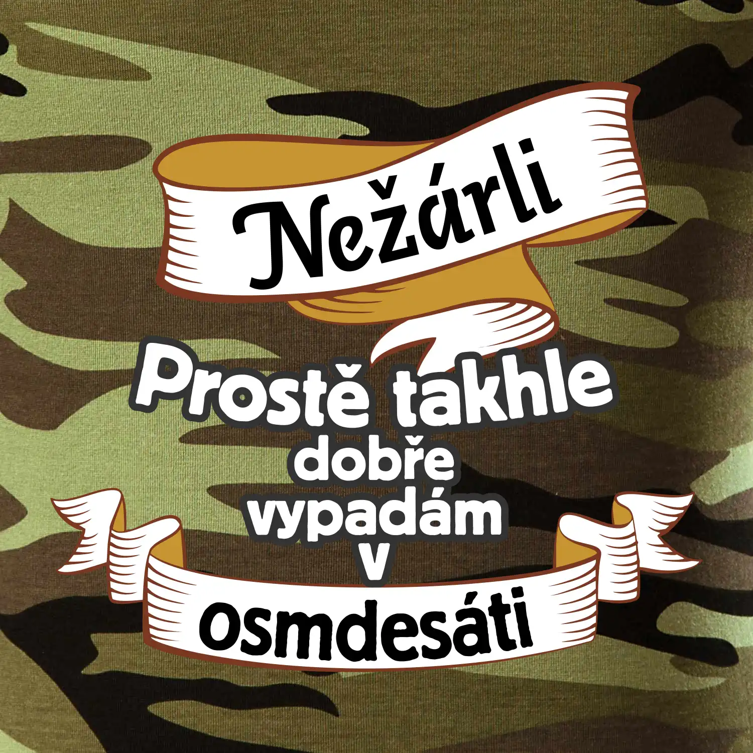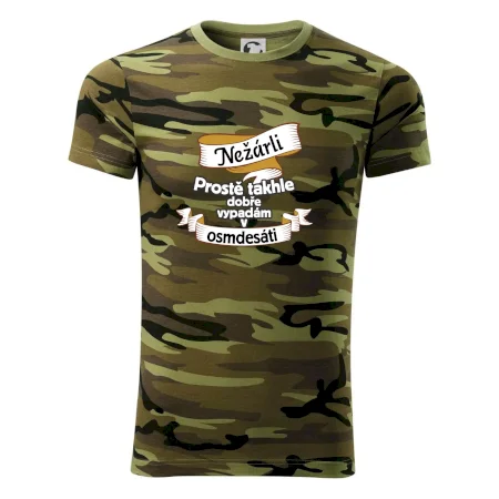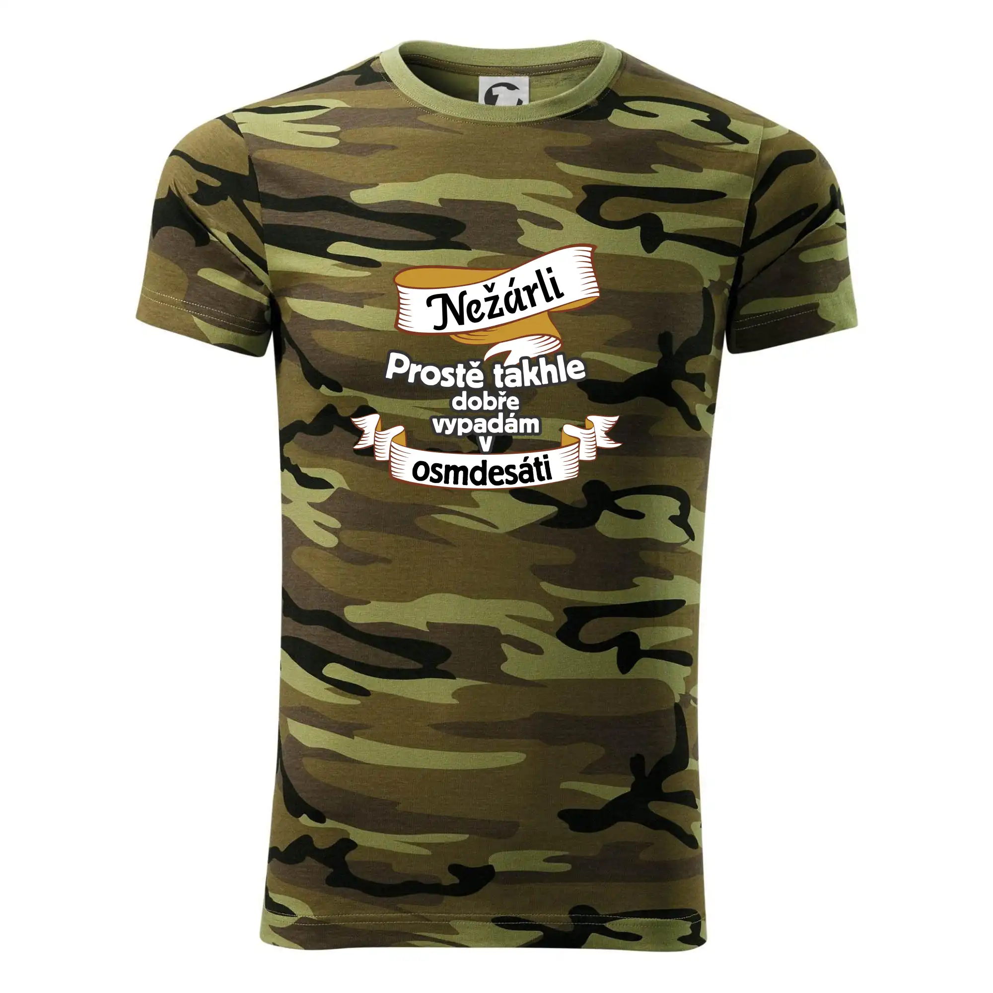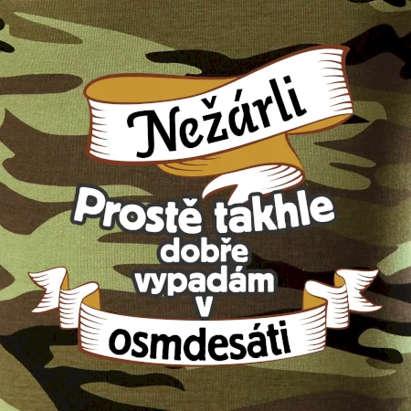 Tričko střední gramáže v barvách camouflage. Střih s bočními švy. Lem průkrčníku ze žebrového úpletu s přídavkem 5 % elastanu. Vnitřní část zadního průkrčníku začištěna páskou v barvě camouflage.