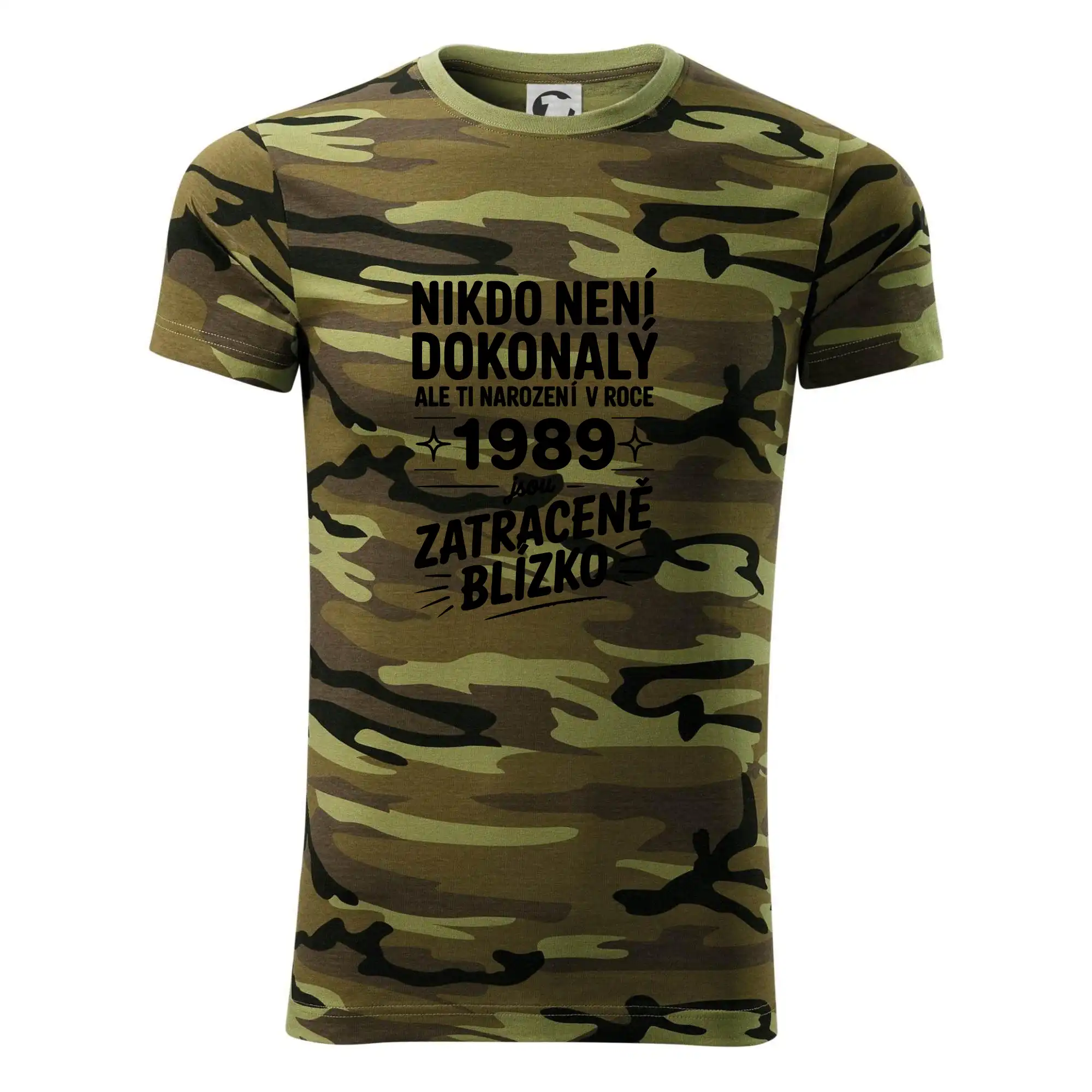 Tričko střední gramáže v barvách camouflage. Střih s bočními švy. Lem průkrčníku ze žebrového úpletu s přídavkem 5 % elastanu. Vnitřní část zadního průkrčníku začištěna páskou v barvě camouflage.