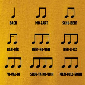 Pamatujete si noty ještě ze školy, nebo jste začínající skladatelé a umíte je nazpaměť? Oslnit můžete v našem triku, tílku, mikině nebo sukni. A ani Váš mrňous nezůstane pozadu, když mu pořídíte bodýčko, nebo tričko s tímto hudebním motivem.