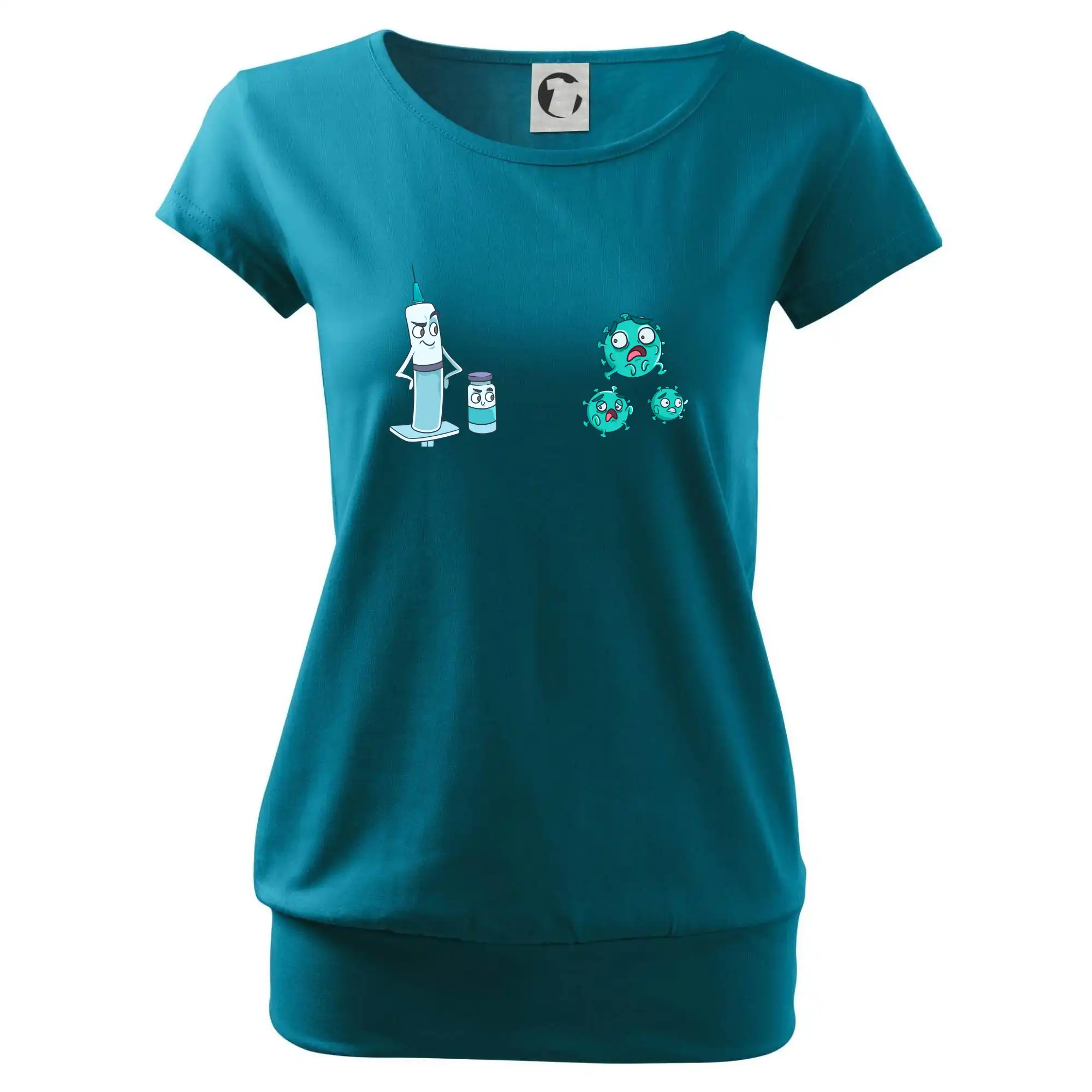Trendové dámské triko s velmi krátkým rukávem, volnějšího střihu, v dolním kraji všité do širokého lemu. Kulatý průkrčník s úzkým lemem ze shodného materiálu.