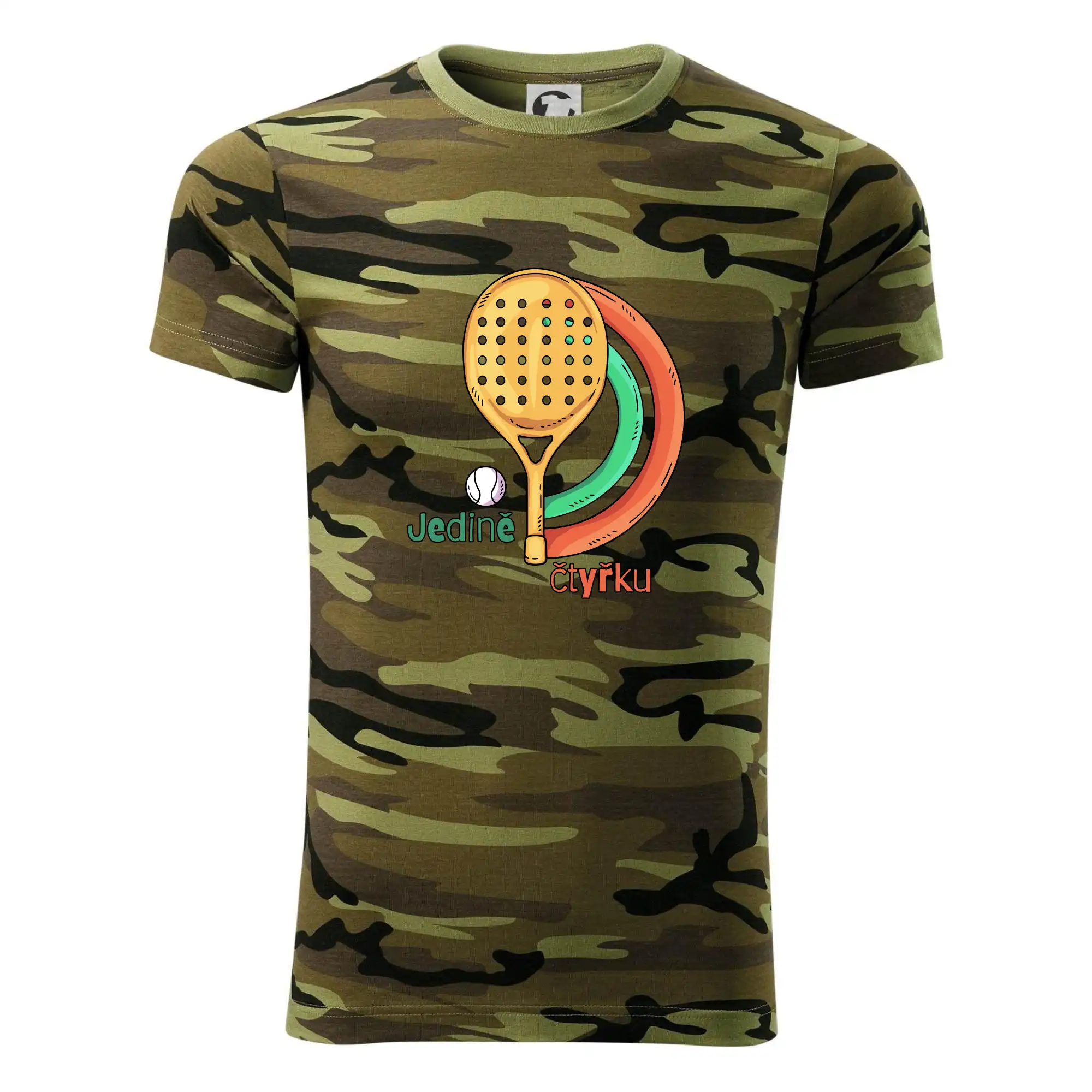 Tričko střední gramáže v barvách camouflage. Střih s bočními švy. Lem průkrčníku ze žebrového úpletu s přídavkem 5 % elastanu. Vnitřní část zadního průkrčníku začištěna páskou v barvě camouflage.