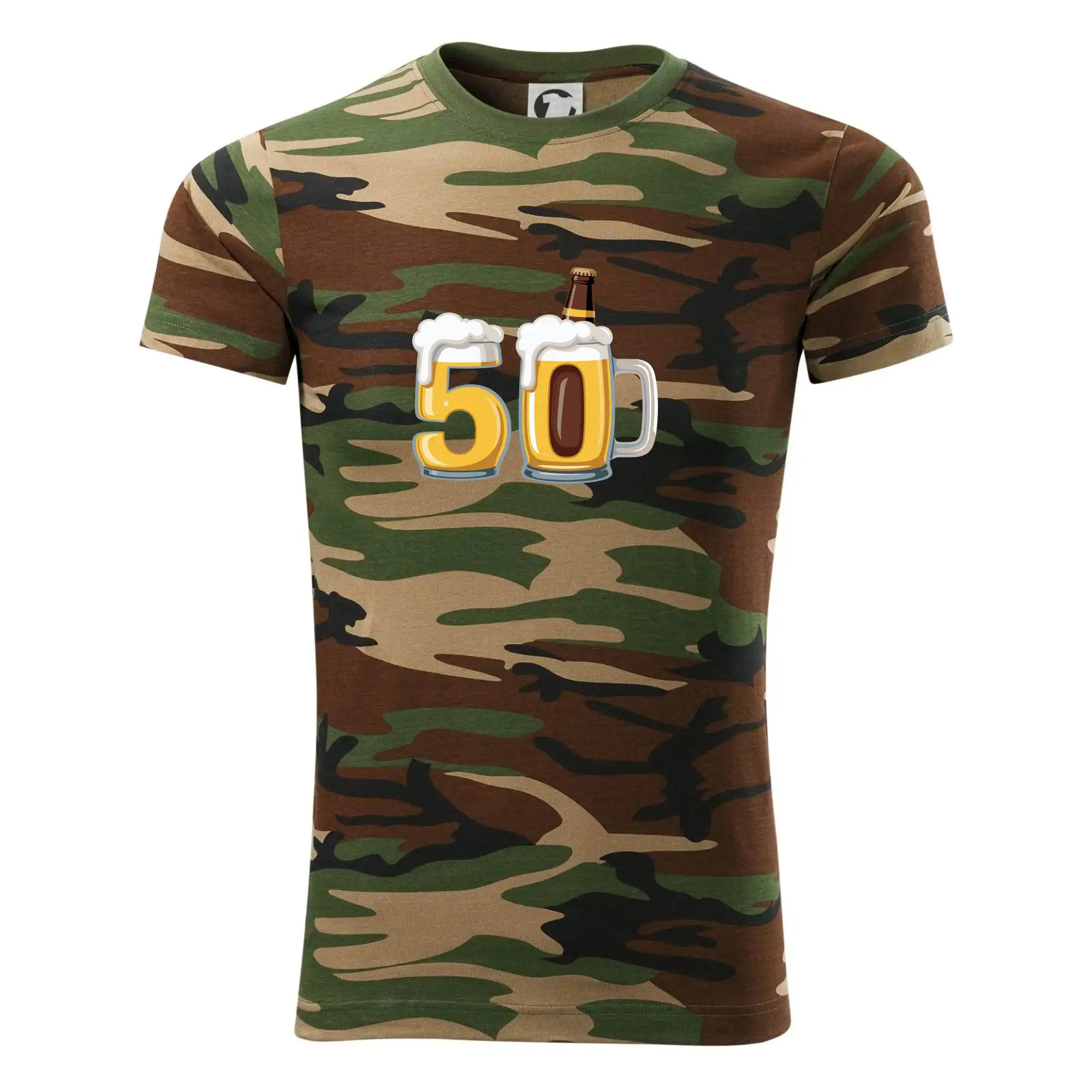 Tričko střední gramáže v barvách camouflage. Střih s bočními švy. Lem průkrčníku ze žebrového úpletu s přídavkem 5 % elastanu. Vnitřní část zadního průkrčníku začištěna páskou v barvě camouflage.