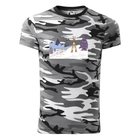 Tričko střední gramáže v barvách camouflage. Střih s bočními švy. Lem průkrčníku ze žebrového úpletu s přídavkem 5 % elastanu. Vnitřní část zadního průkrčníku začištěna páskou v barvě camouflage.