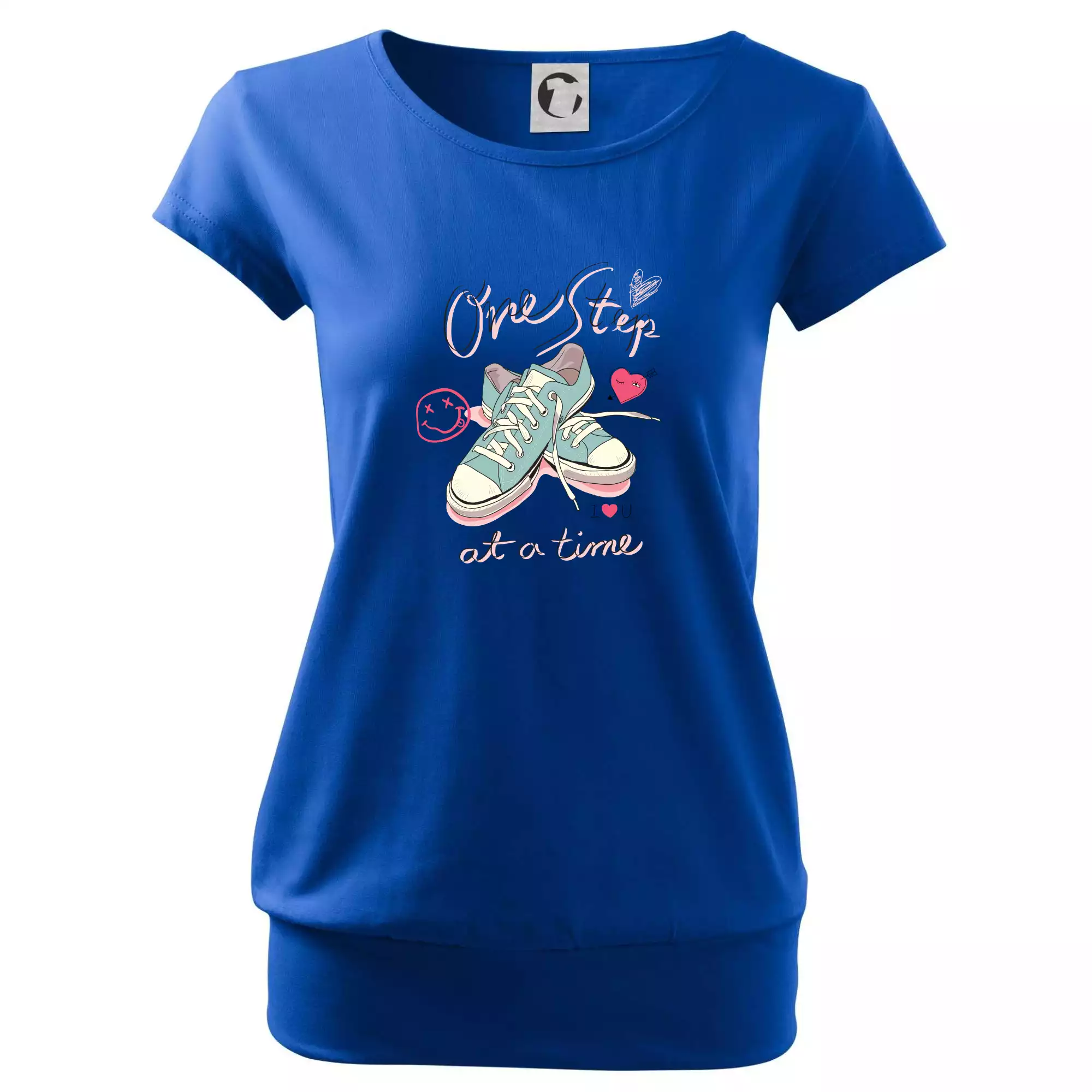 Trendové dámské triko s velmi krátkým rukávem, volnějšího střihu, v dolním kraji všité do širokého lemu. Kulatý průkrčník s úzkým lemem ze shodného materiálu.