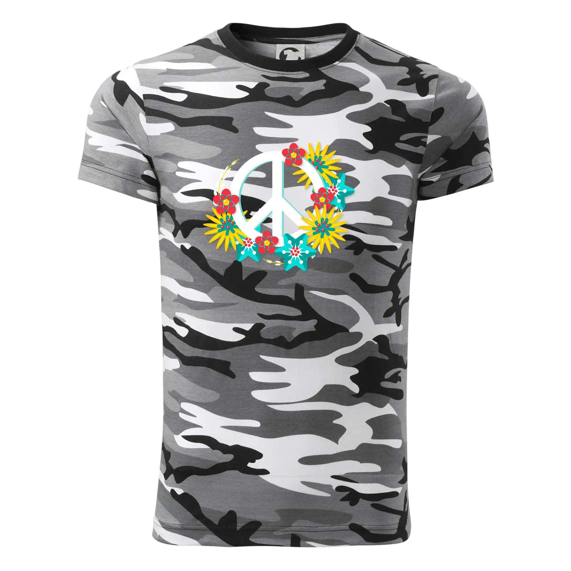Tričko střední gramáže v barvách camouflage. Střih s bočními švy. Lem průkrčníku ze žebrového úpletu s přídavkem 5 % elastanu. Vnitřní část zadního průkrčníku začištěna páskou v barvě camouflage.